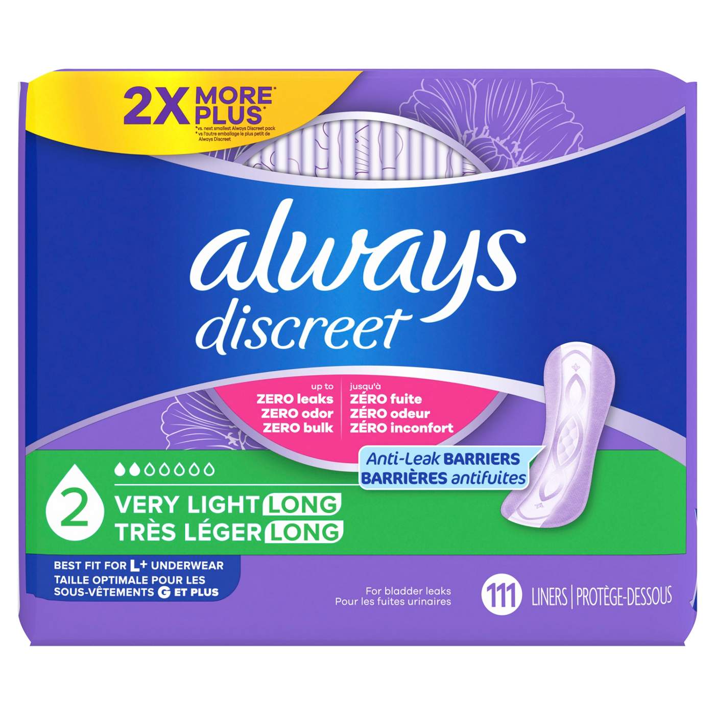 Bladder leaks shouldn't hold you back. With Always Discreet, they don't have to. Start living life uninhibited by a weak bladder and urinary incontinence with protection you can count on and feel comfortable wearing. Always Discreet Liners for incontinence are designed to fit your body and your lifestyle, with a slim profile you can barely feel! And since these revolutionary panty liners stay comfortably in place and fit discreetly under your clothing, you can walk with poise and confidence every day. Now made with an improved end-to-end core for better overactive bladder protection and all-day comfort (when compared to previous Always Discreet products), incontinence liners with our layered RapidDry core turn liquid into gel to lock leaks away and keep you dry. Side LeakGuards help keep wetness from reaching the edges to avoid messes, so you can leave any worries of adult incontinence behind. Find Always Discreet incontinence liners for women in the size and absorbency level that's right for your needs. If sneezing or laughing causes bladder leaks, Always Discreet Very Light Liners offer the ideal amount of protection. If you feel like you may need more coverage, look for liners with a longer length and greater absorbency. Available in Regular and Long Length.