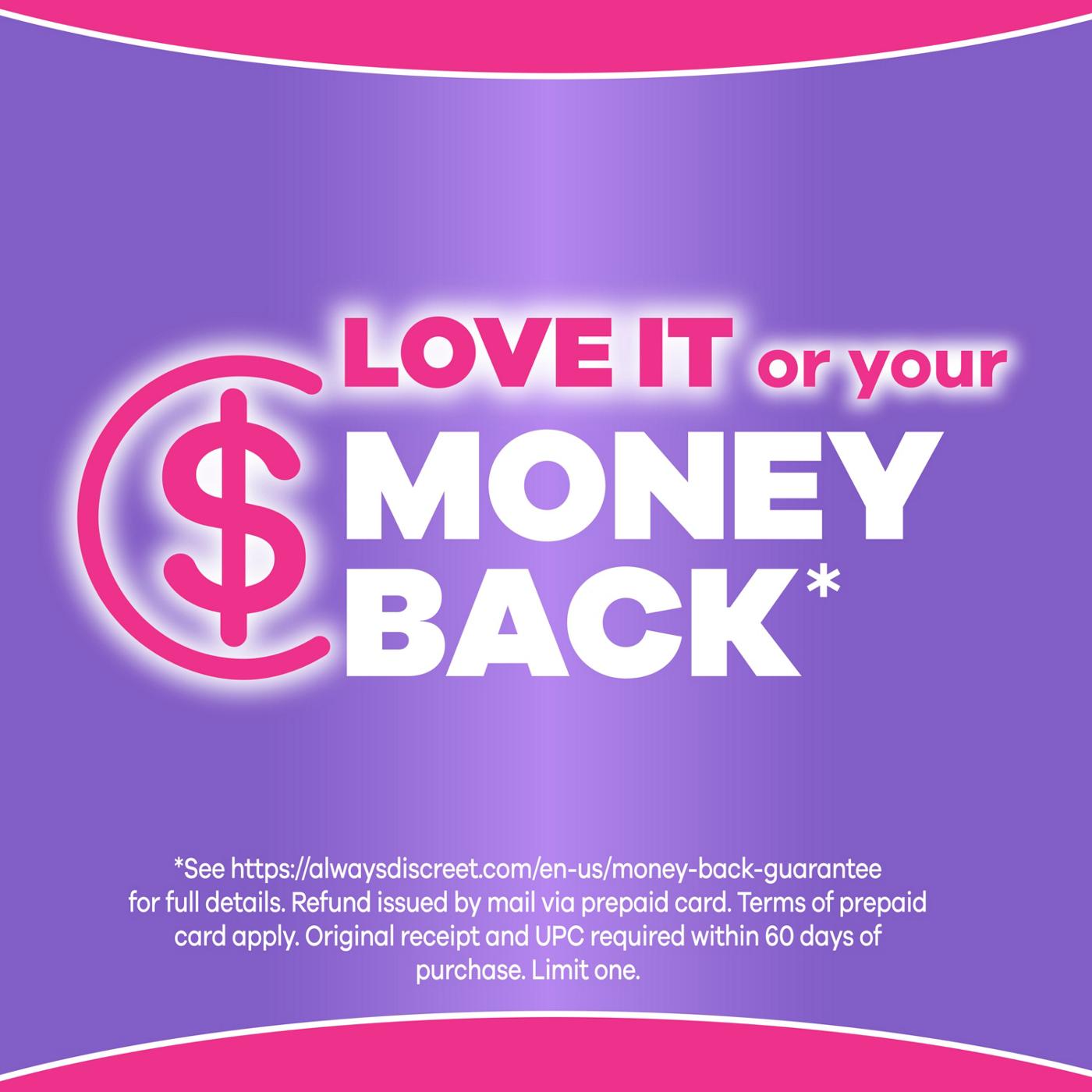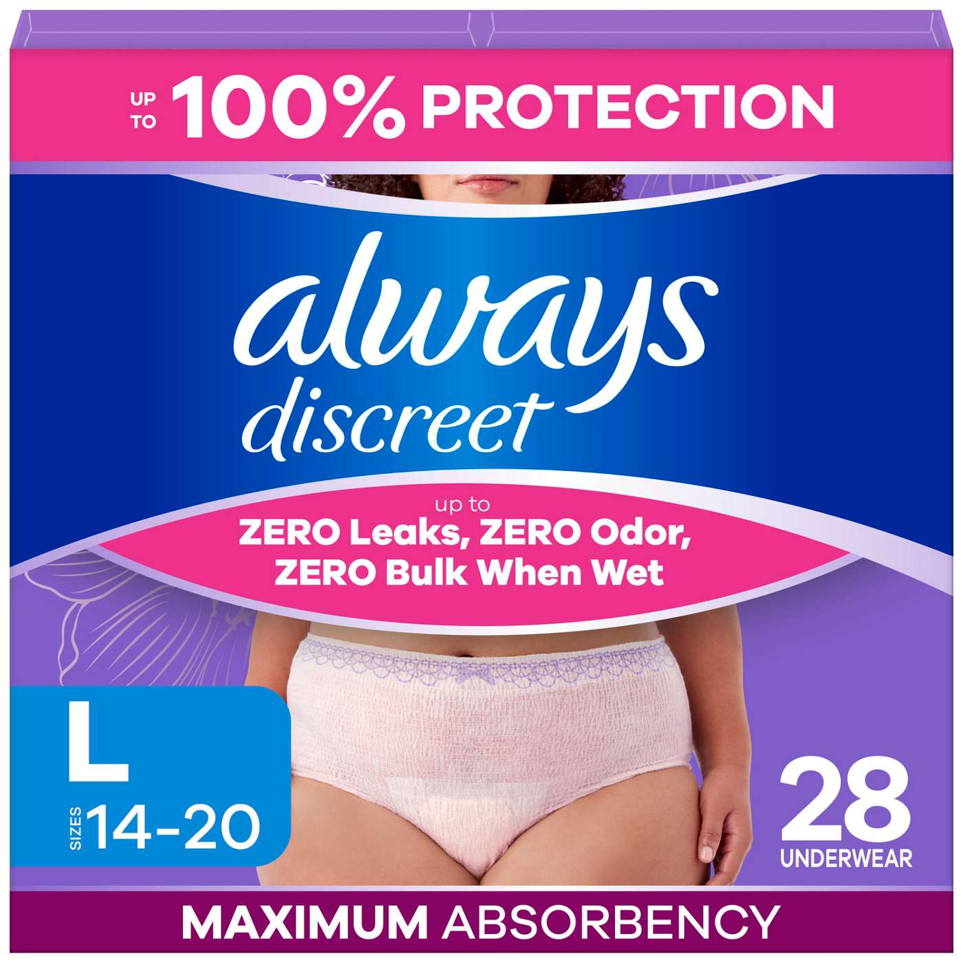 Try Always Discreet incontinence underwear for women. These reimagined adult diapers for women have up to zero leaks, zero odor, and zero bulk when wet for incontinence protection you can depend on. Designed to fit up to 95% of body shapes, these reimagined adult diapers for women range from sizes 2-26W+. Perfect for everyday use and also ideal as postpartum underwear, our products have a cottony soft 4 way stretch that fits like real underwear. These innovative disposable underwear for women feature a super absorbent core that wicks away moisture and turns liquid to gel, ensuring up to 12 hours of maximum absorbency and up to 100% leak-free protection you can depend on. These reimagined adult diapers for women also have LeakGuards that help contain leaks and prevent incontinence overflow and Odorlock technology that continually neutralizes odor. These lightly scented incontinence underwear for women are 40% drier* (*vs. leading brand) for all day freshness and confidence. As an HSA/FSA eligible product, managing your incontinence has never been easier. Embrace life without limits and choose Always Discreet - reimagined adult diapers for women you can depend on! Love it or your money back (*see alwaysdiscreet.com for full details. Refund issued by mail via prepaid card. Terms of prepaid card apply. Original receipt and UPC required within 60 days of purchase. Limit one).​