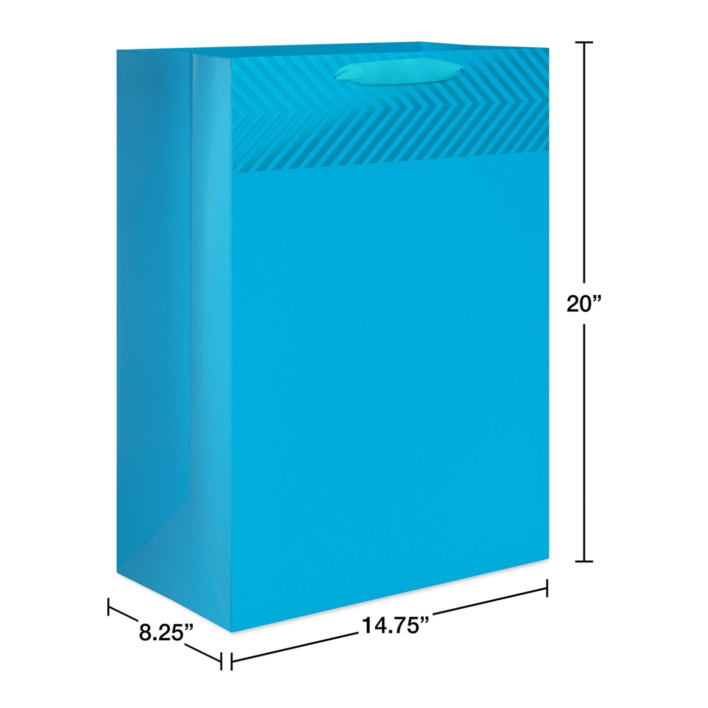 Give more than just an amazing present with this jumbo gift bag! This design features a band of blue chevron metallic foil against a blue kraft bag and a satin ribbon handle. Jumbo size is ideal for holding clothing, books, stuffed animals, electronics, and more! Top off your gift bag with coordinating tissue paper (sold separately) and you’re ready to share some smiles!