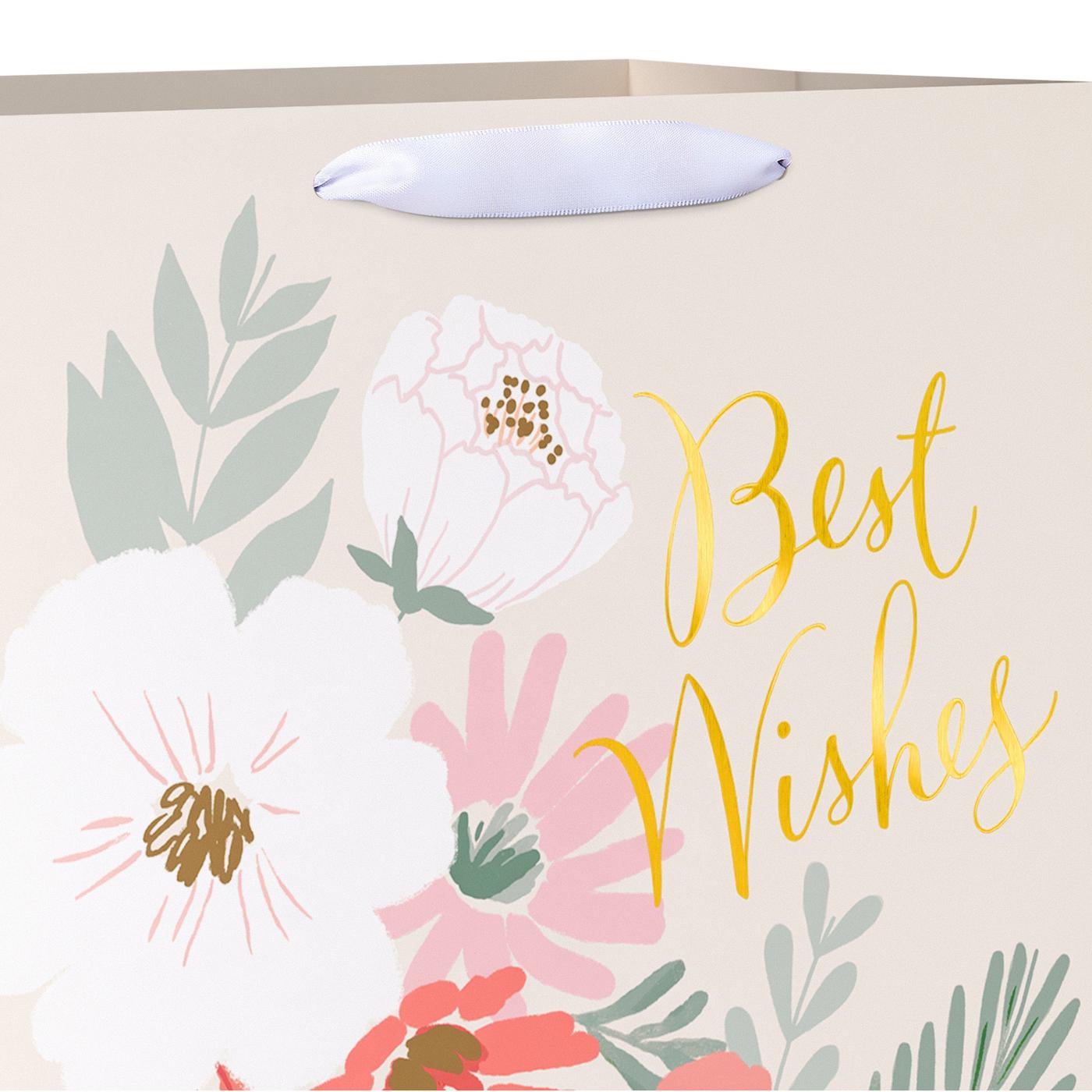 • DESIGN & FINISHINGS: This elegant jumbo gift bag boasts a beautiful floral design with vibrant shades of pink and white flowers, perfectly complementing the golden 'Best Wishes' script for a classy wedding presentation.