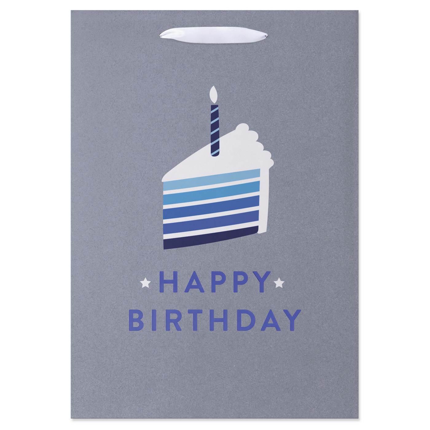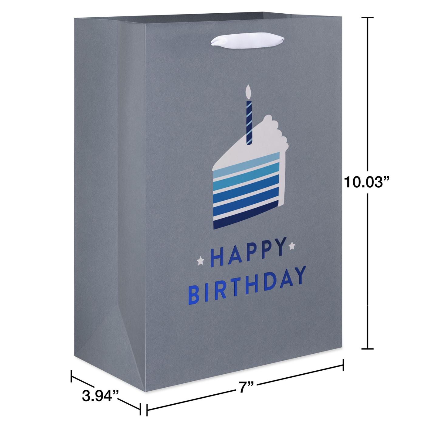 Give more than just an amazing present with this medium gift bag! This design features blue lettering spelling “Happy Birthday” with a blue and white cake slice against a silver background. Metallic foil accents and a satin ribbon handle complete the bag. Medium gift bags are perfect for wrapping special gifts like clothing, home decor items, toys, stuffed animals, electronics, and other hard-to-wrap presents. Top off the gift bag with coordinating tissue paper (sold separately) to complete your perfect package!