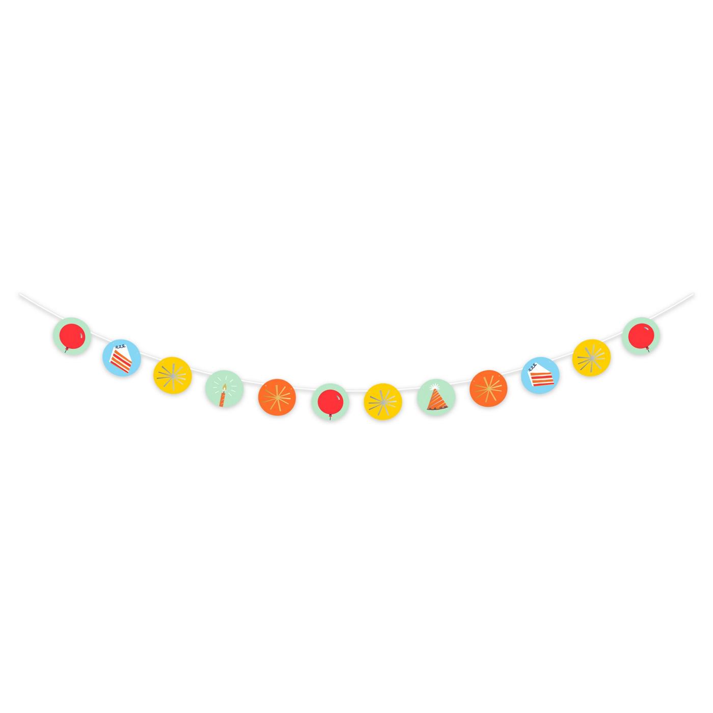 Add a touch of your personal style to your celebration by decorating with this 7-foot party banner. It’s easy to assemble and features food icons in each circle, with a white ribbon holding it all together. Hang it from a doorway, a dessert table, mantel, or anywhere you’d like. This fun, colorful banner is sure to add something special to your party!