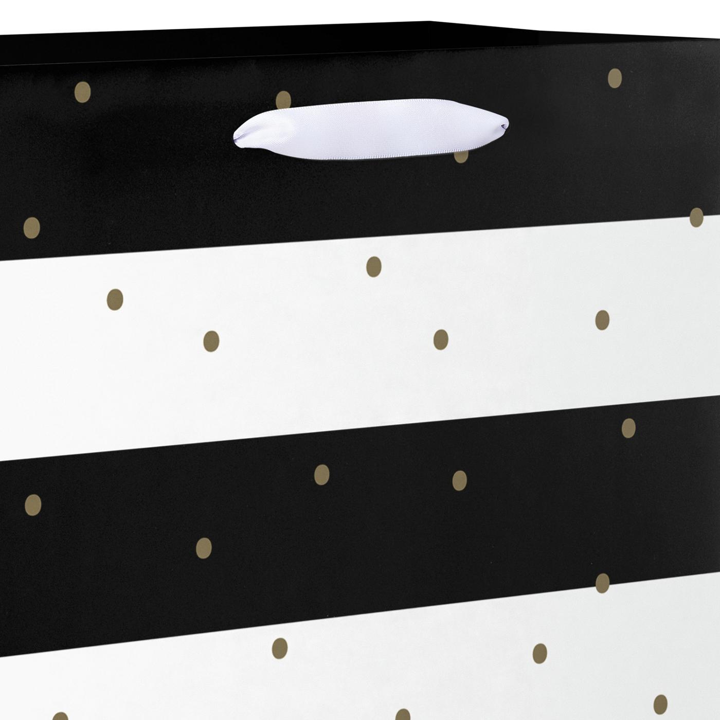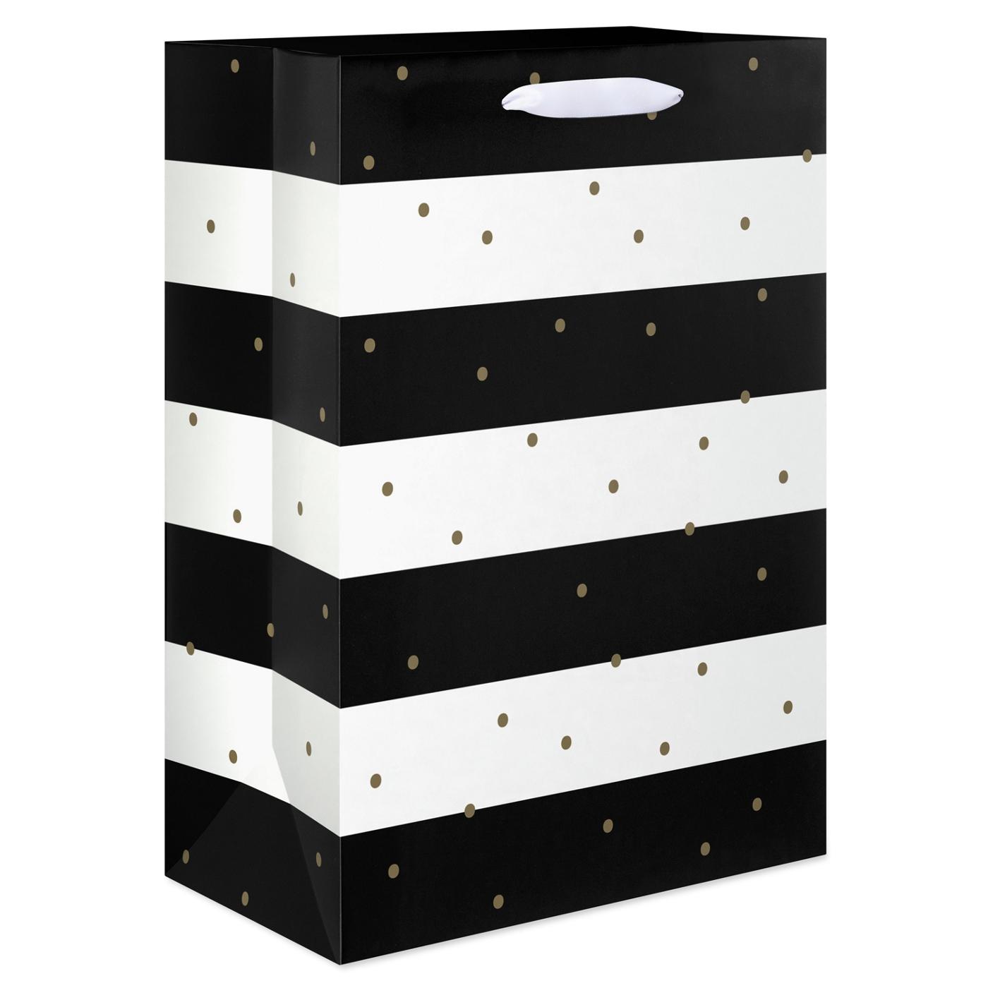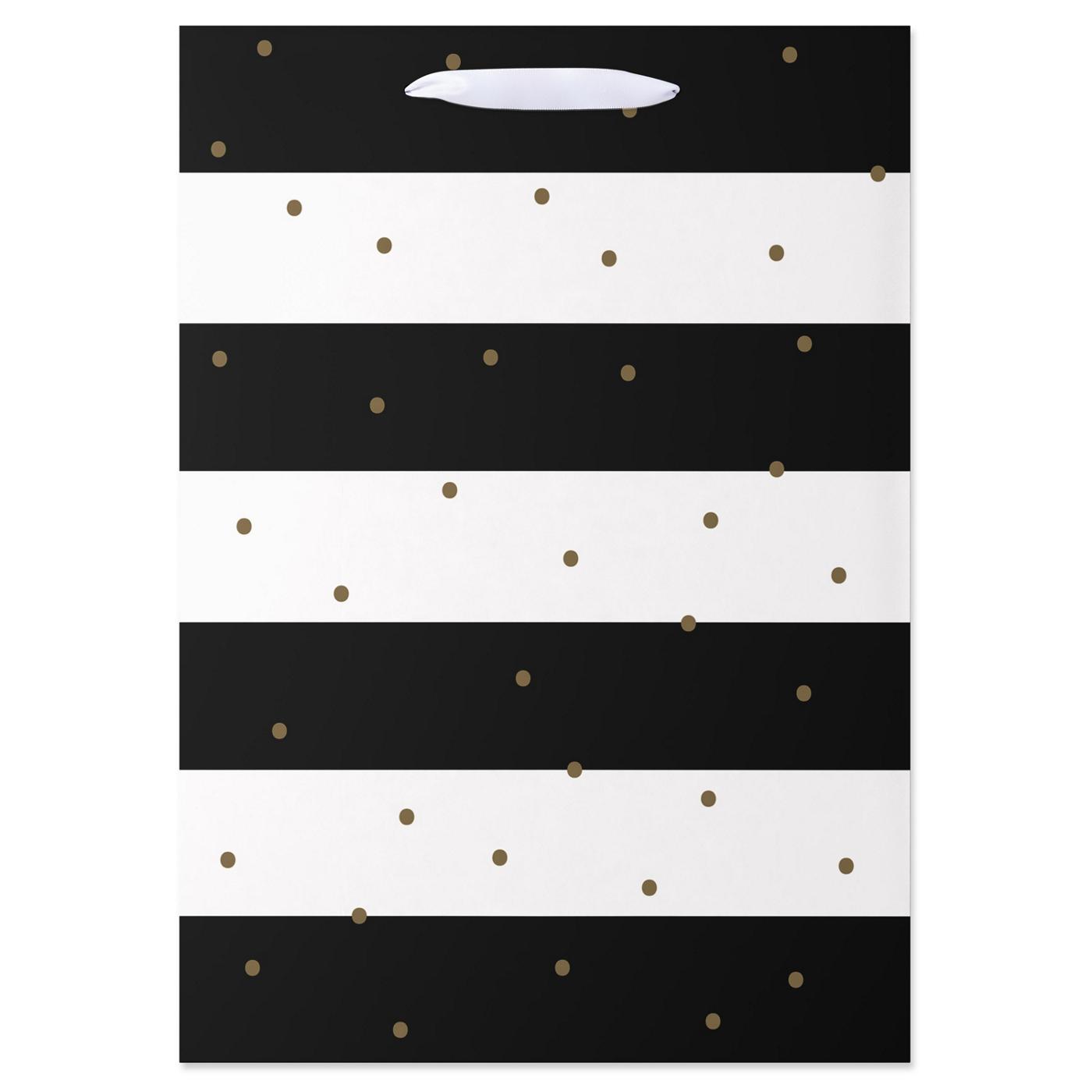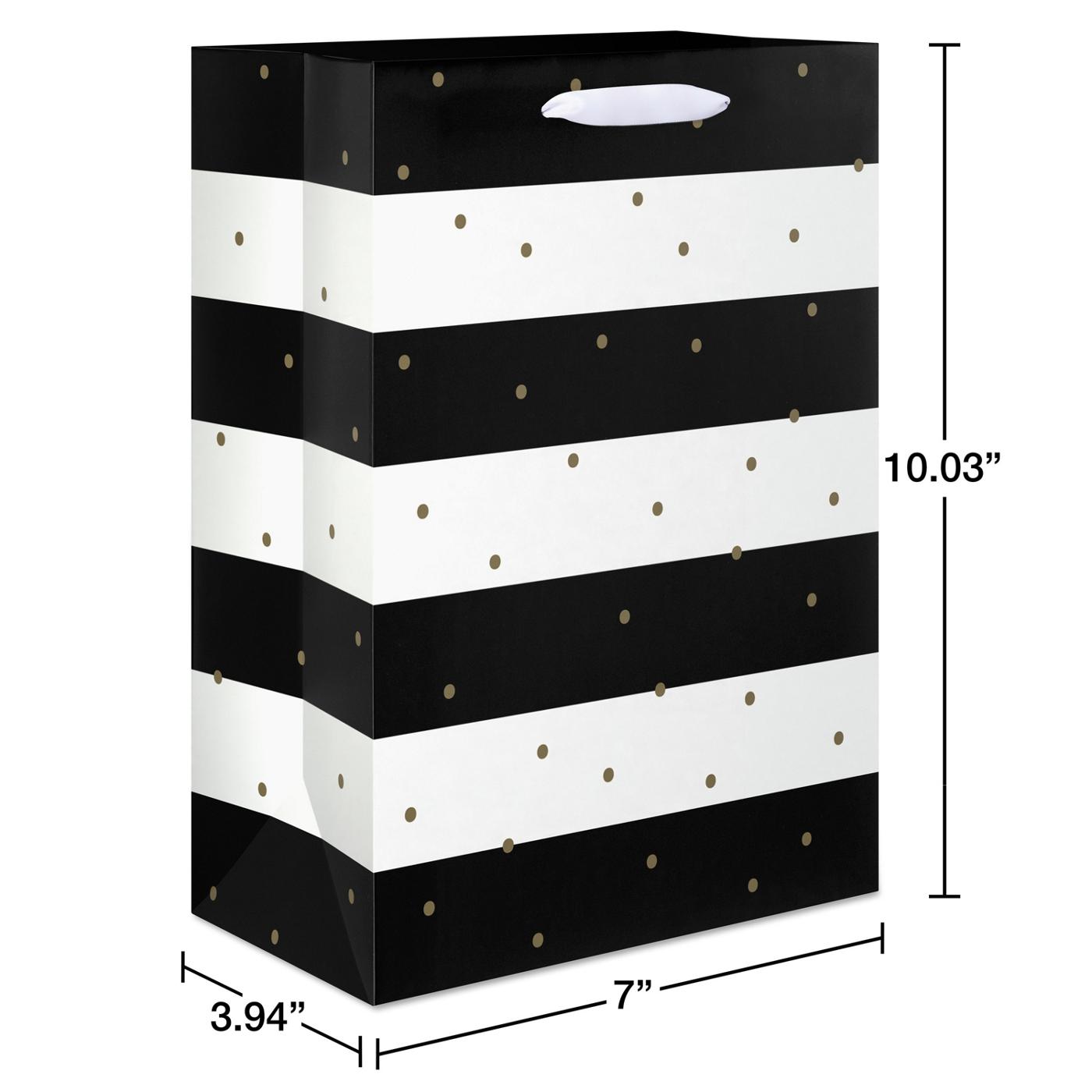 Give more than just an amazing present with this medium gift bag! This design features white and black stripes and gold dots with a satin ribbon handle. Medium gift bags are perfect for wrapping special gifts like clothing, home decor items, toys, stuffed animals, electronics, and other hard-to-wrap presents. Top off the gift bag with coordinating tissue paper (sold separately) to complete your perfect package!