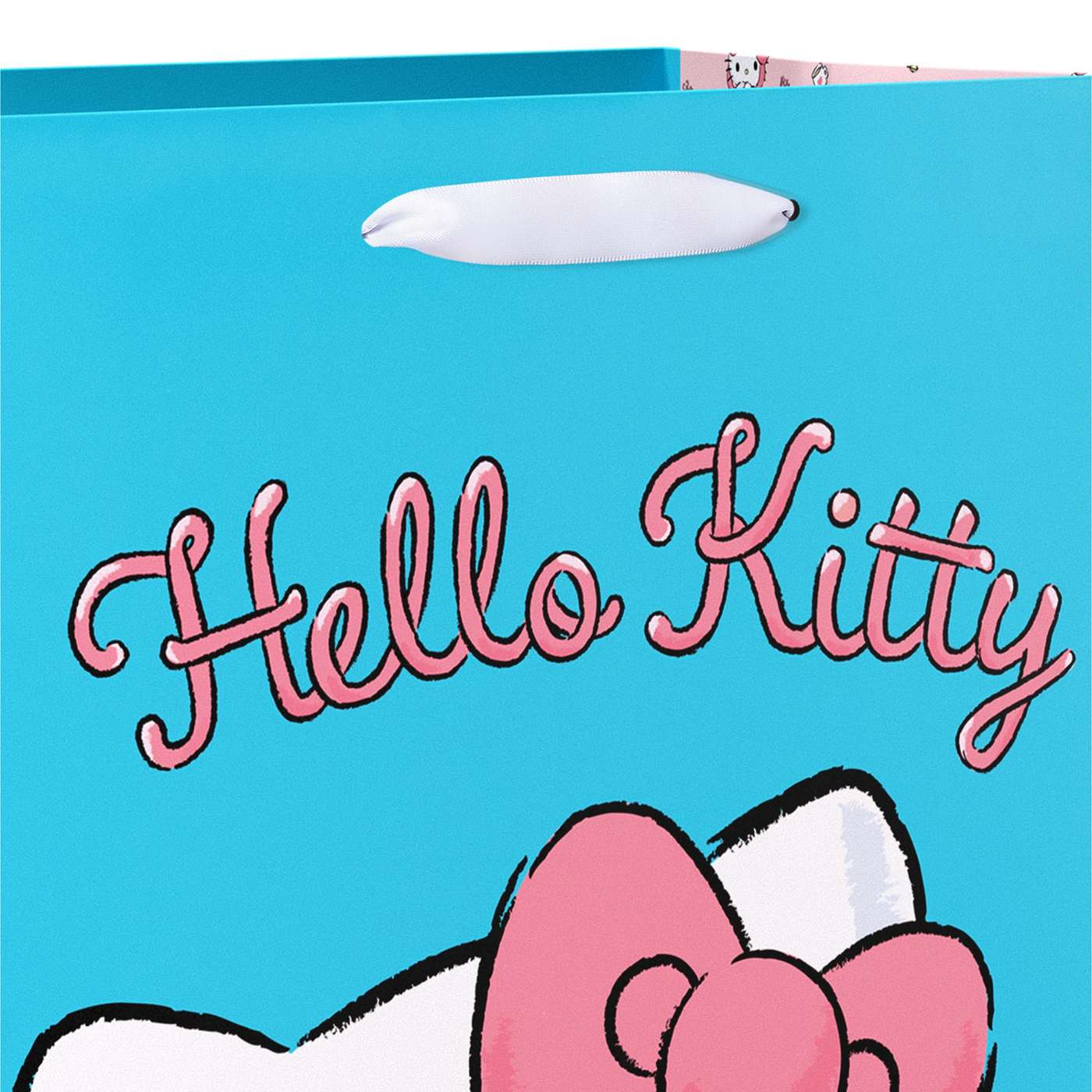 • Hello Kitty themed gift bag features Hello Kitty with her signature pink bow on a vibrant turquoise background