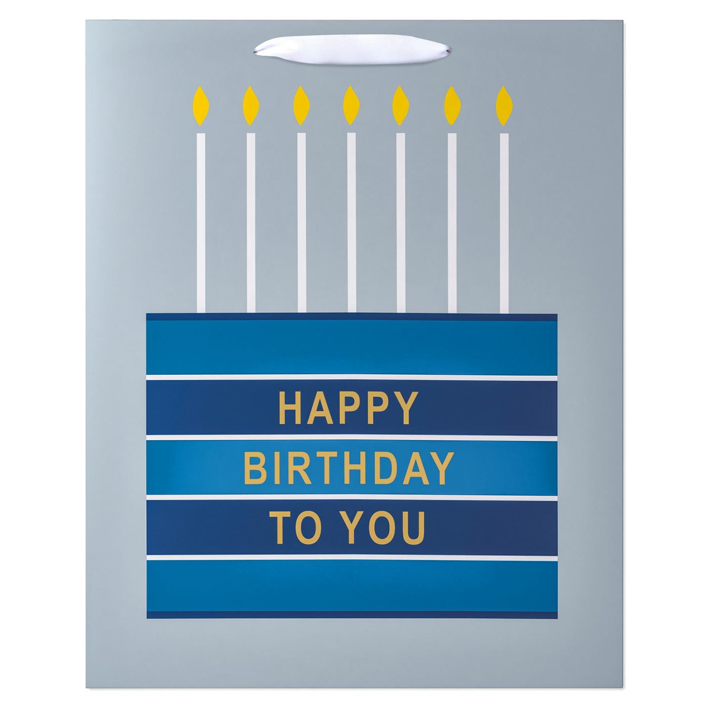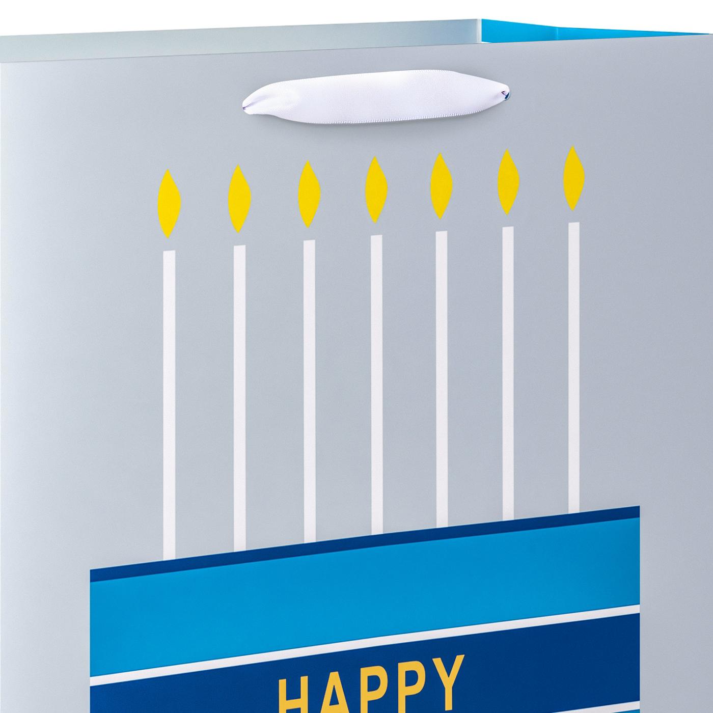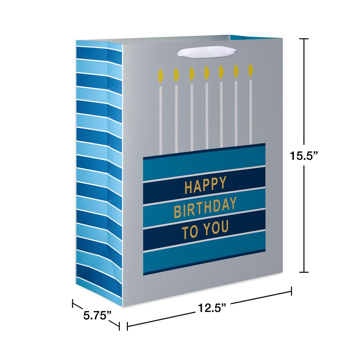 • This gift bag features a blue striped cake with candles and Happy Birthday text.
