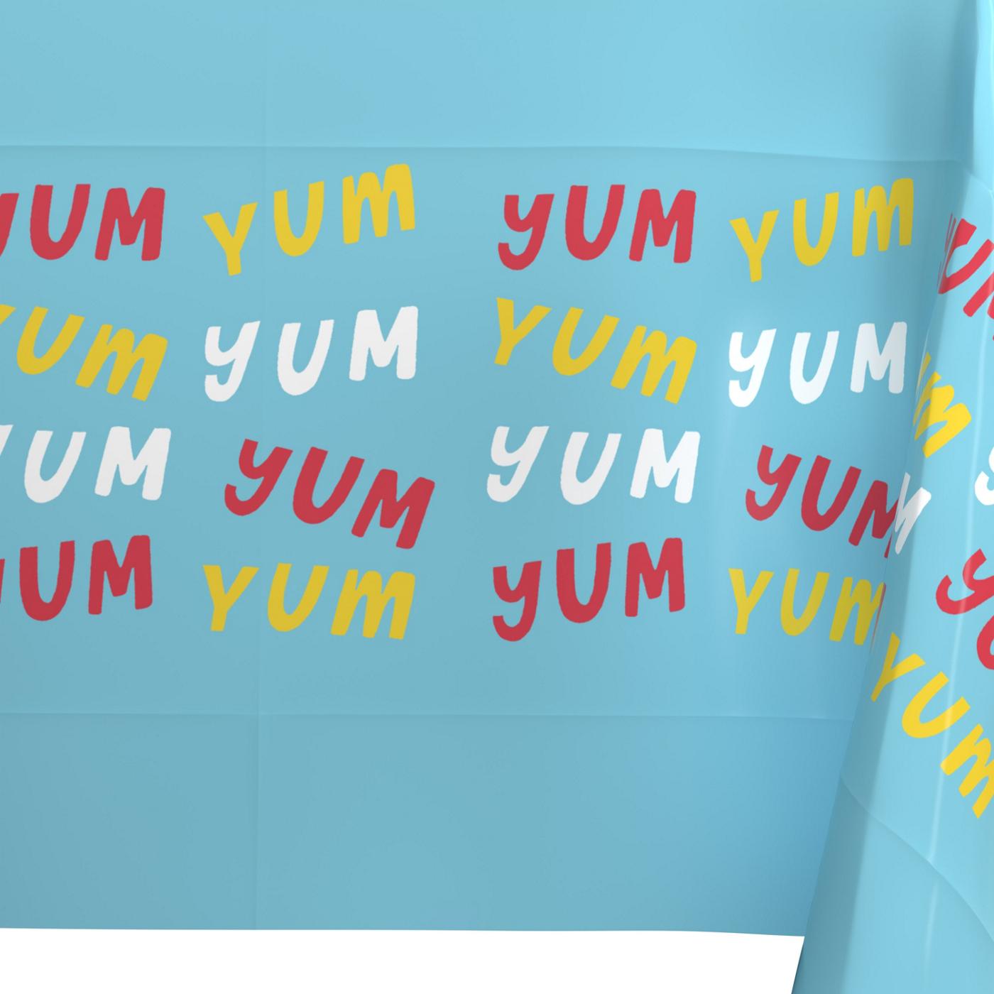 • Table cover features a light blue background with colorful 'Yum' on the edges
