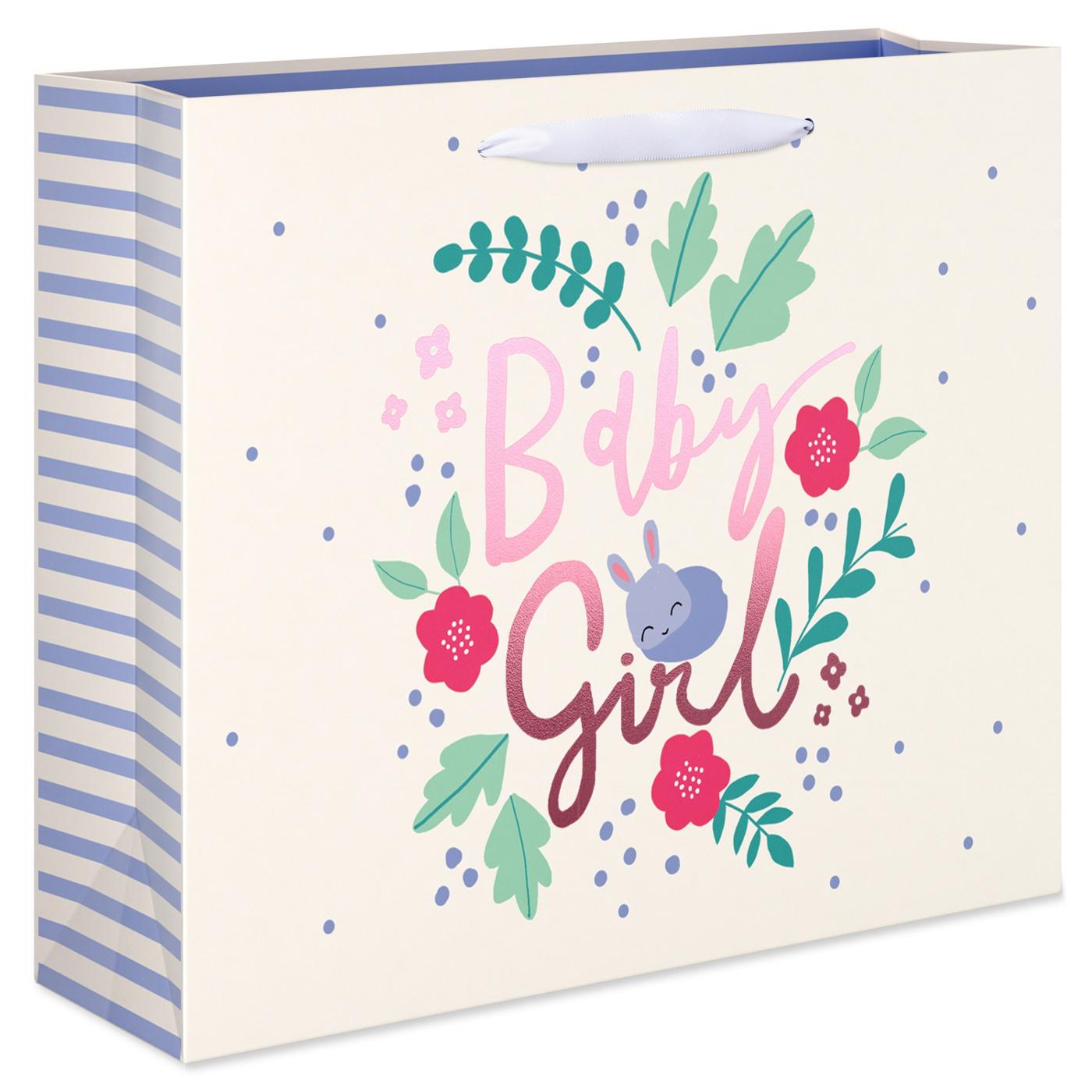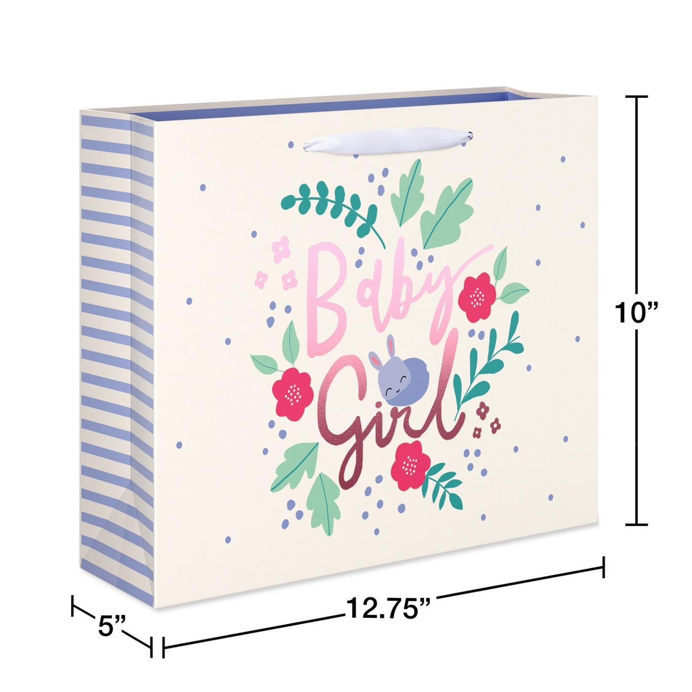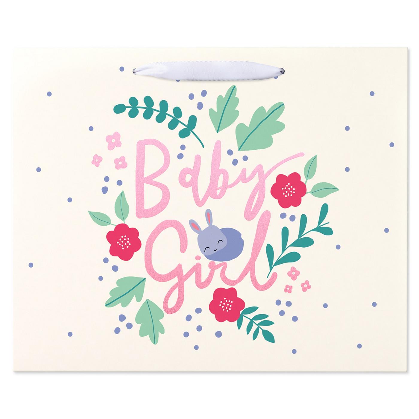 • This gift bag features adorable Baby Girl lettering with a playful bunny and floral accents on an ivory background.