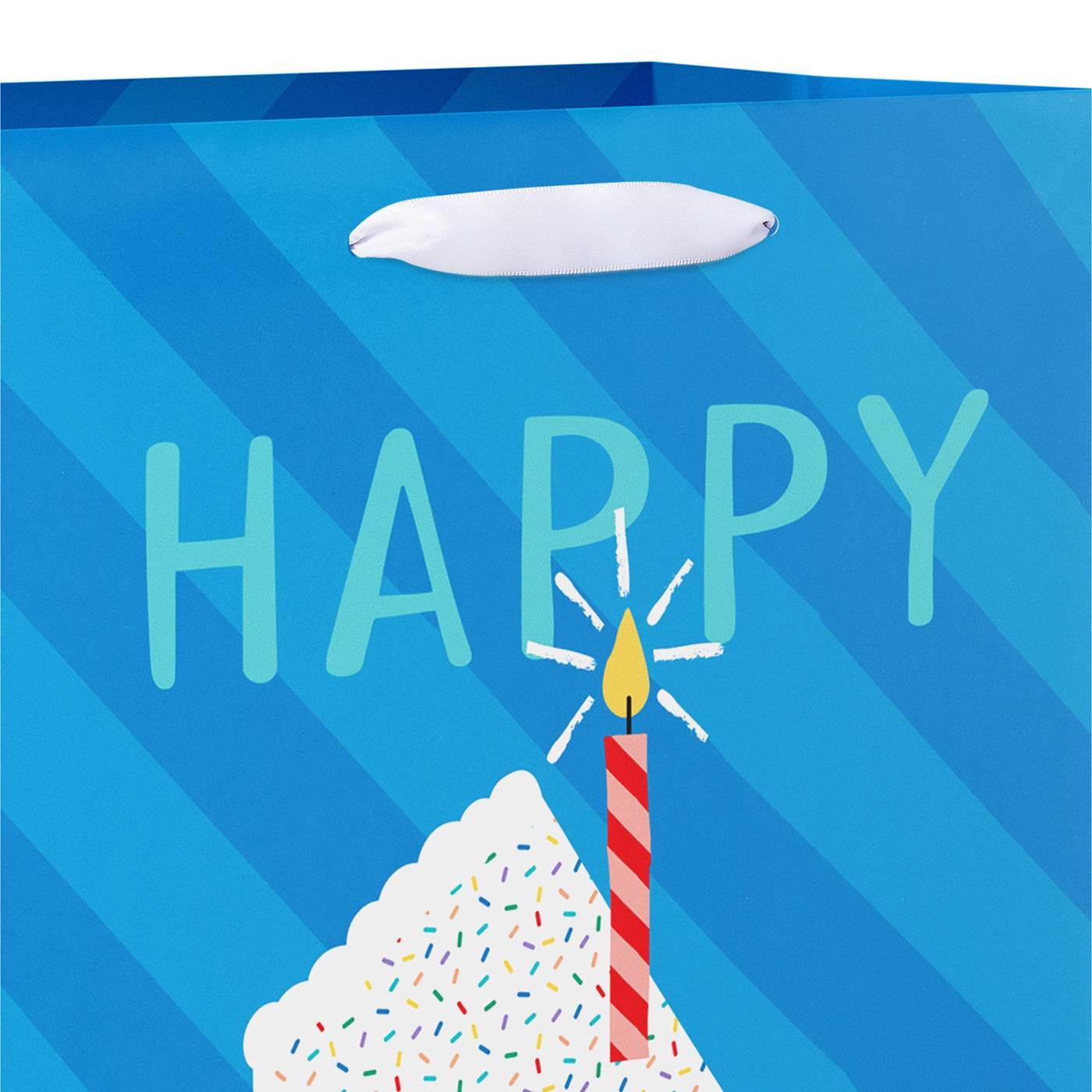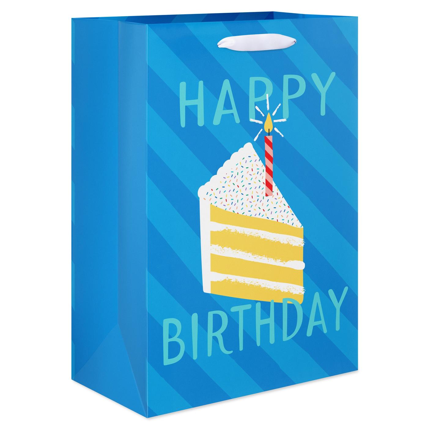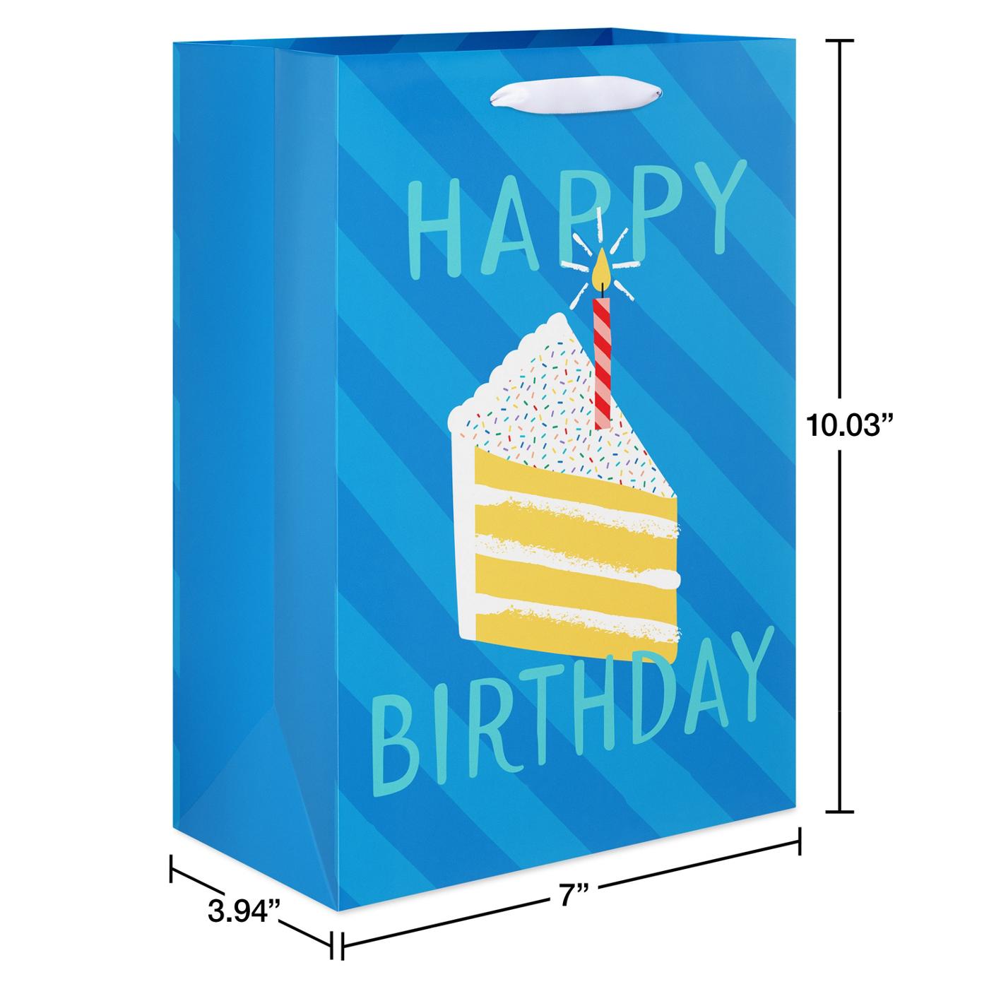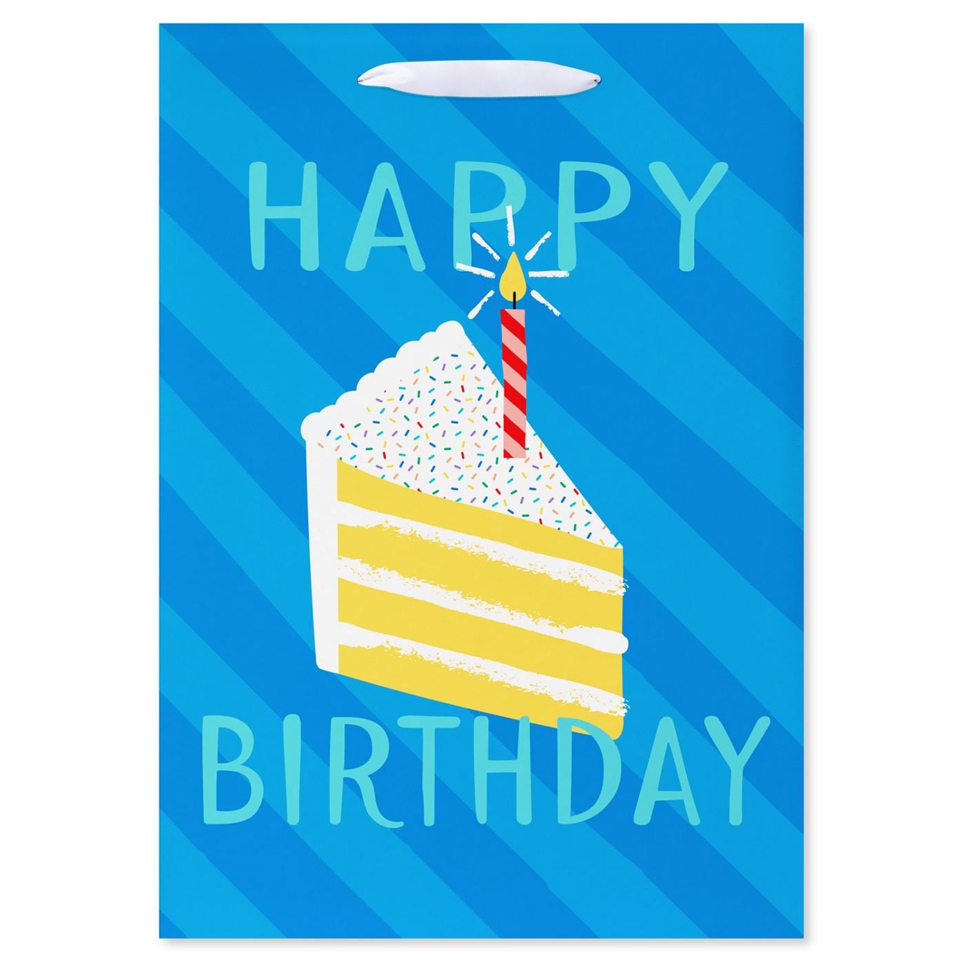 • This birthday gift bag features bright and cheerful birthday gift bag featuring a vibrant cake slice with a lit candle