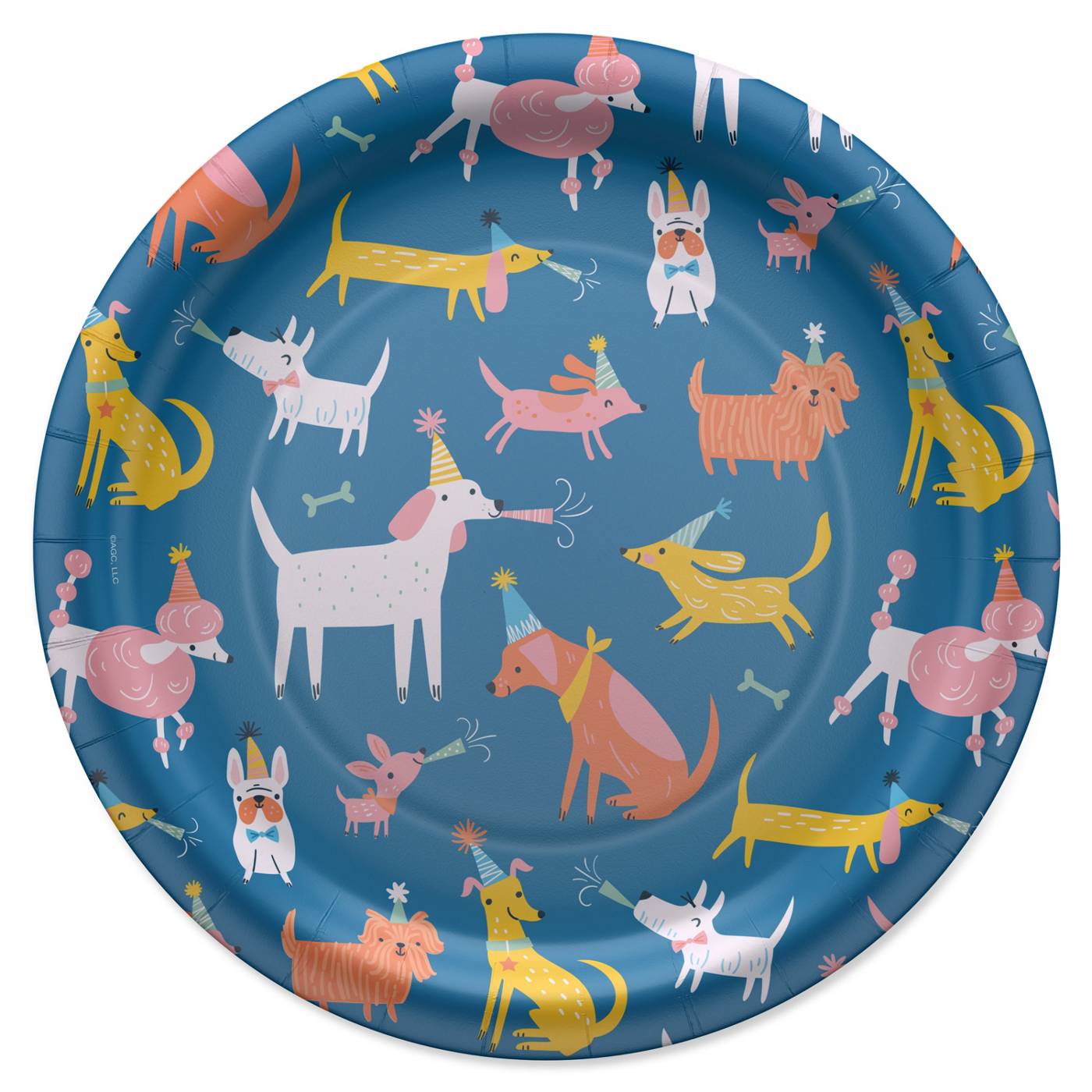 • This American Greetings round 9" birthday plate features multi-colored dogs on a blue background