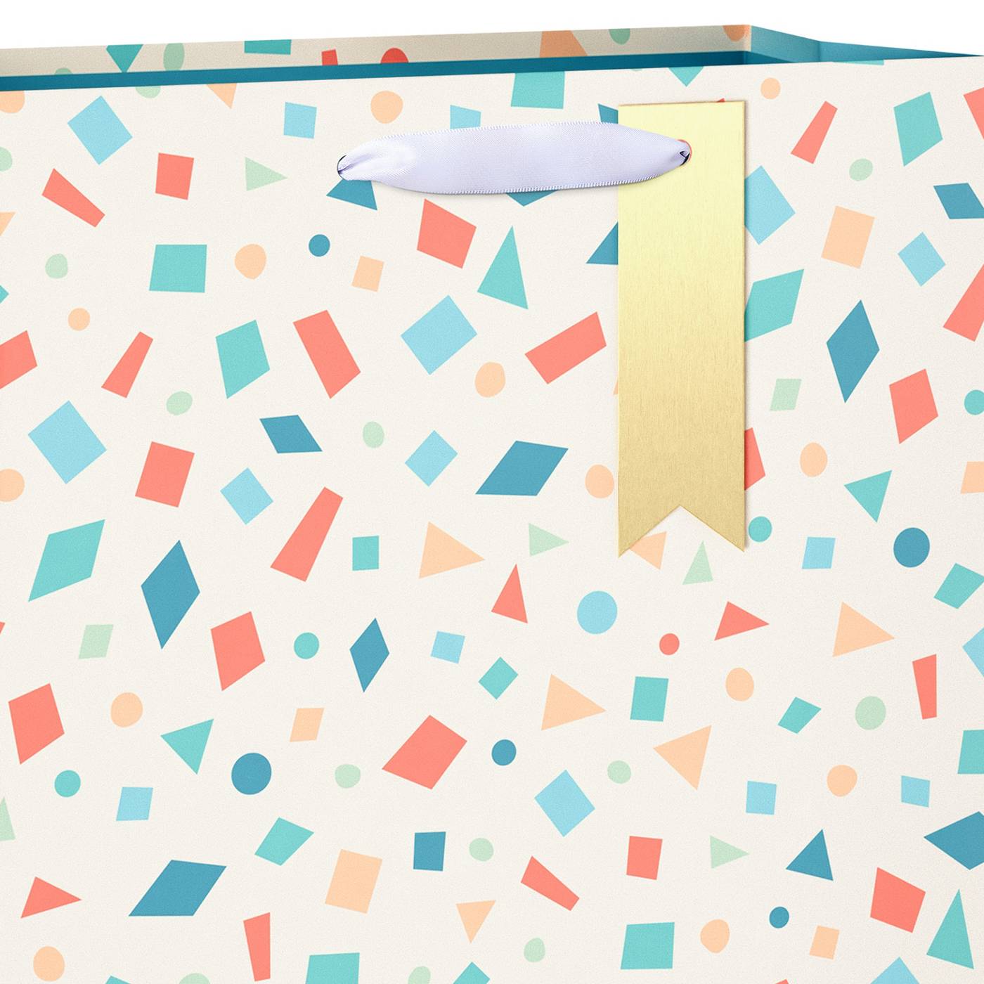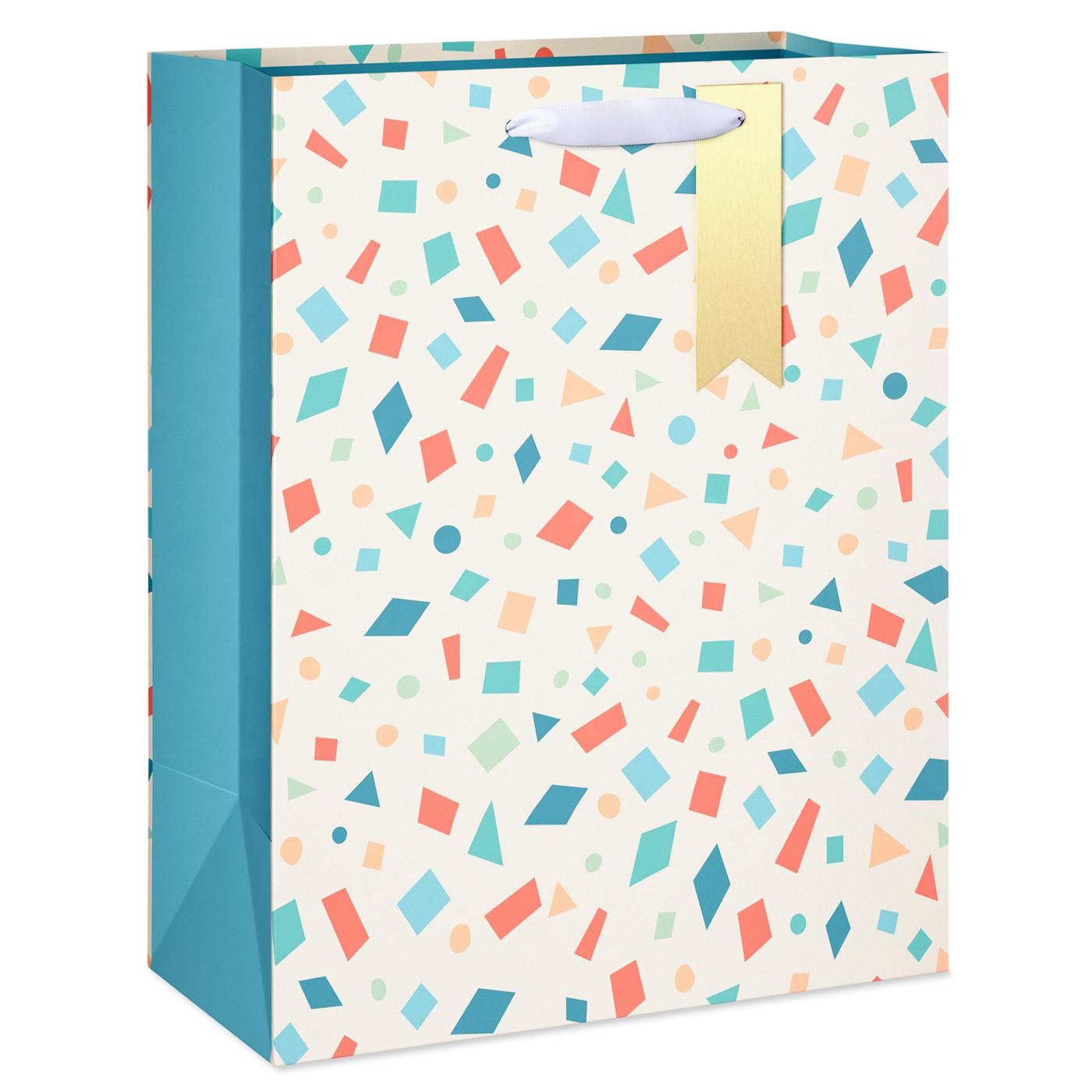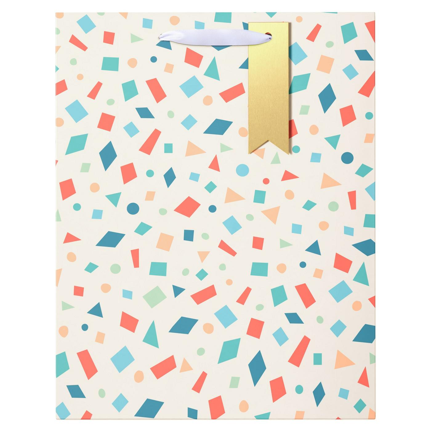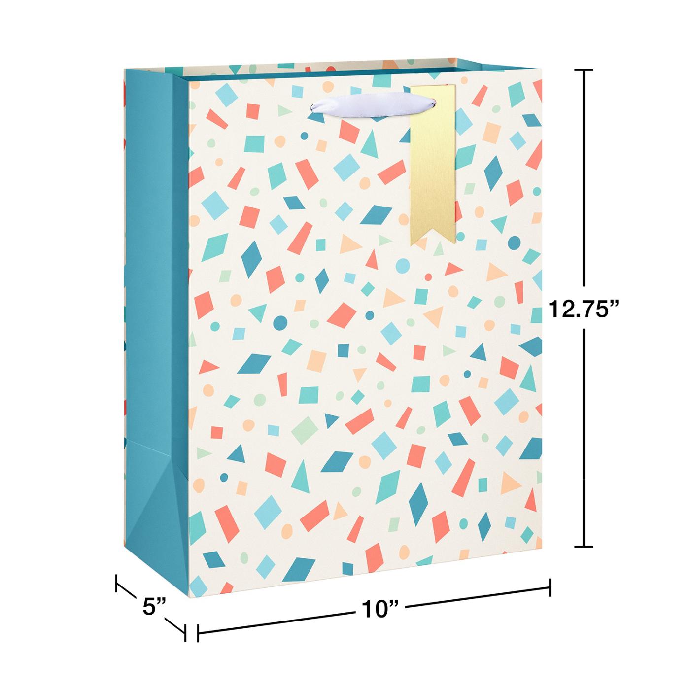 • Gift bag features playful confetti pattern in joyful colors with a stylish golden tag for a personalized message