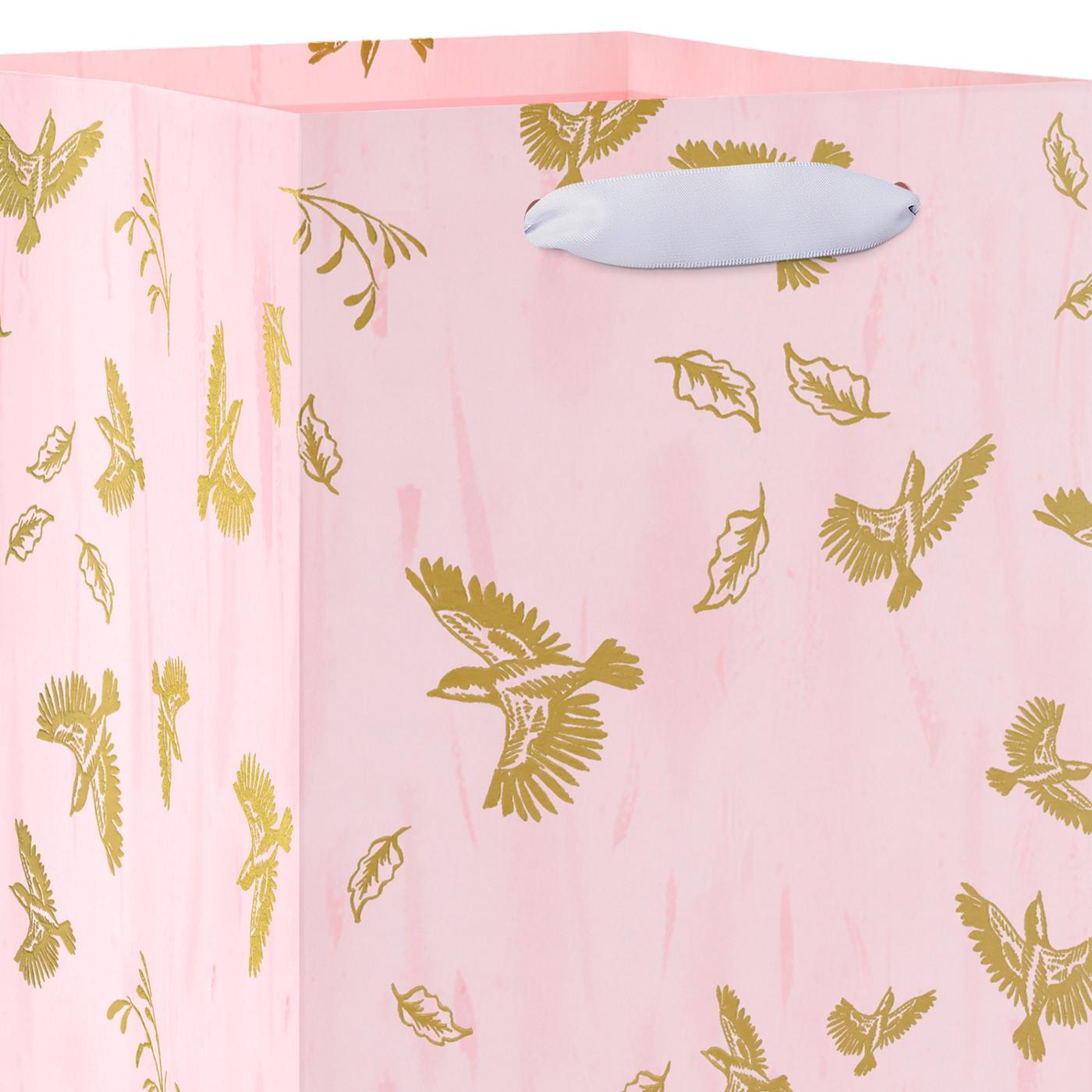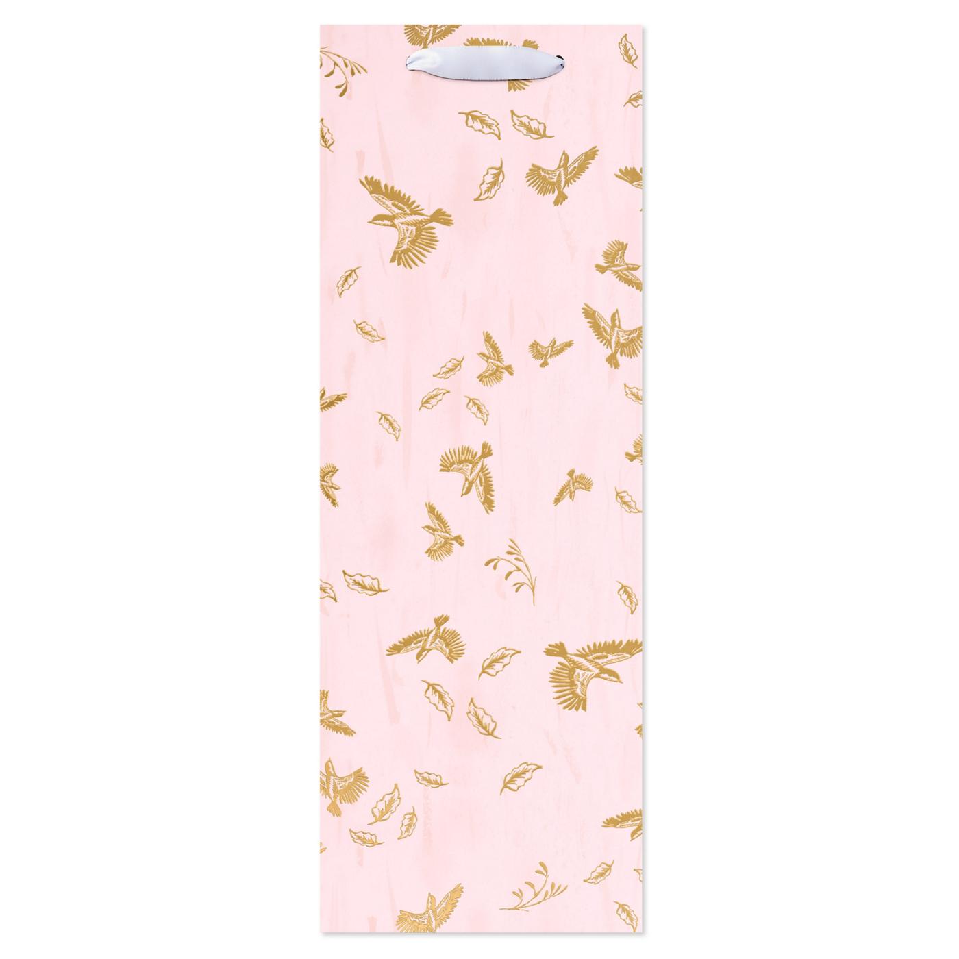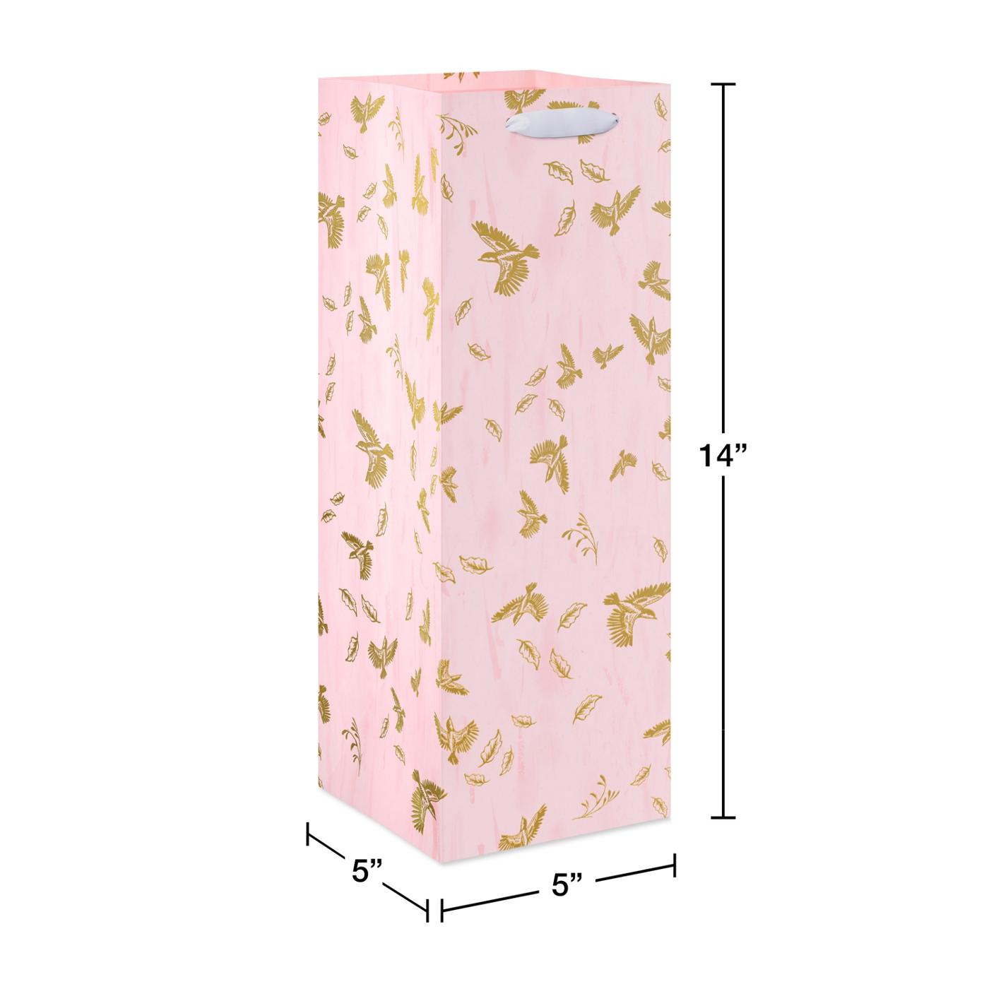 Cheers to the perfect way to give a bottle of their favorite beverage in a tasteful way! This beverage bag features an elegant design of gold birds on a pink background and includes satin ribbon handles. The sturdy bag is a great way to gift a bottle of wine or liquor or other drinks for a birthday or any special occasion. Pair with coordinating tissue paper and ribbon (sold separately) to complete the polished look.
