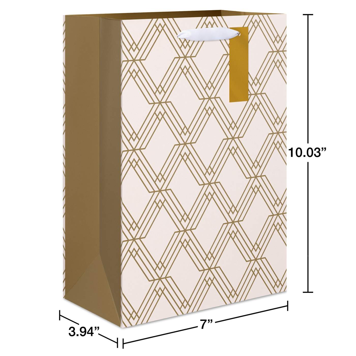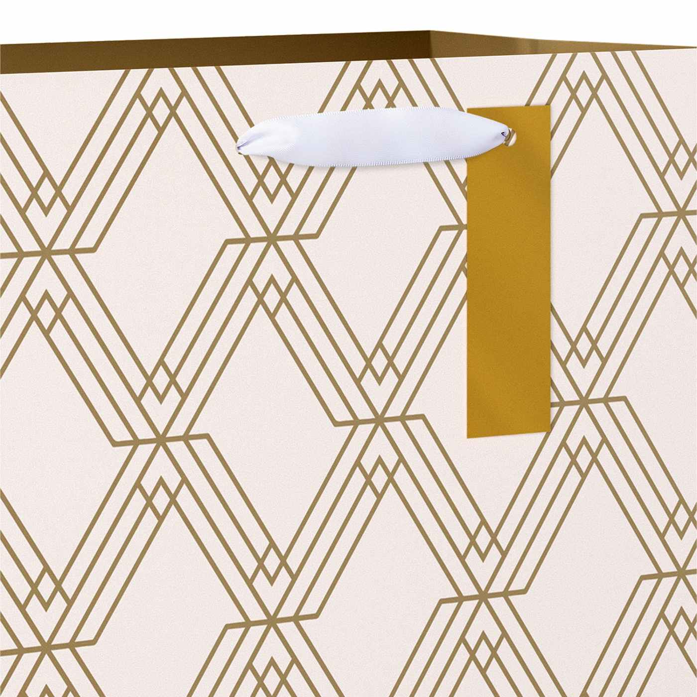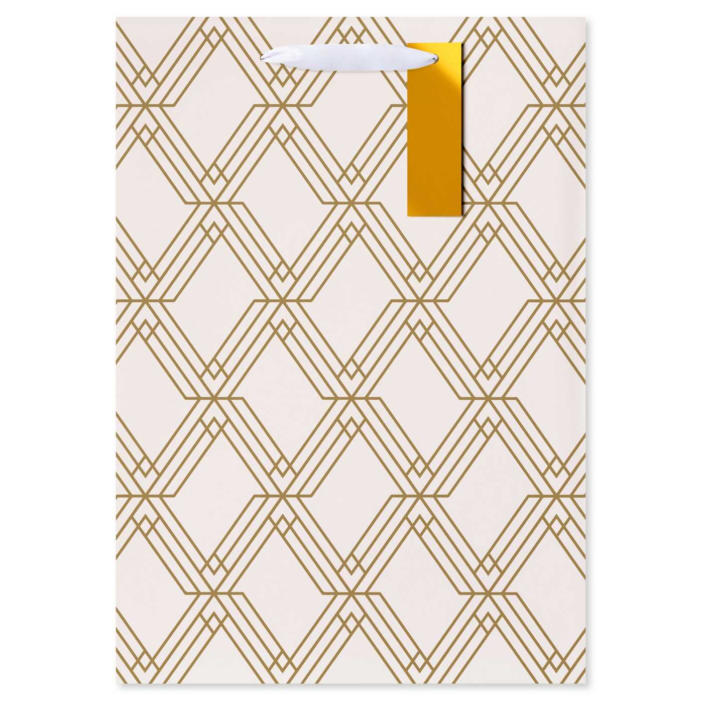 • Gift bag features elegant gold geometric pattern on a cream background