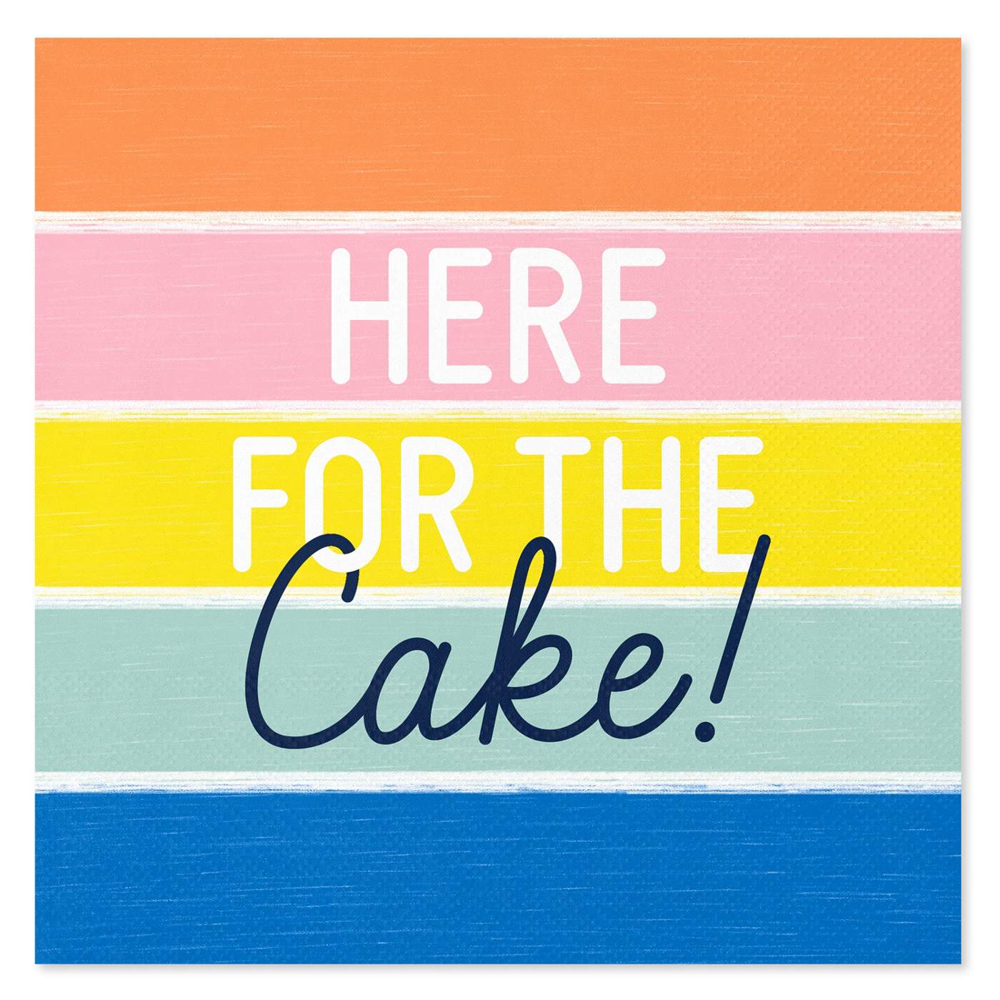 • Lunch napkins are 2-ply and feature colorful horizontal lines with 'Here for the Cake' on the front