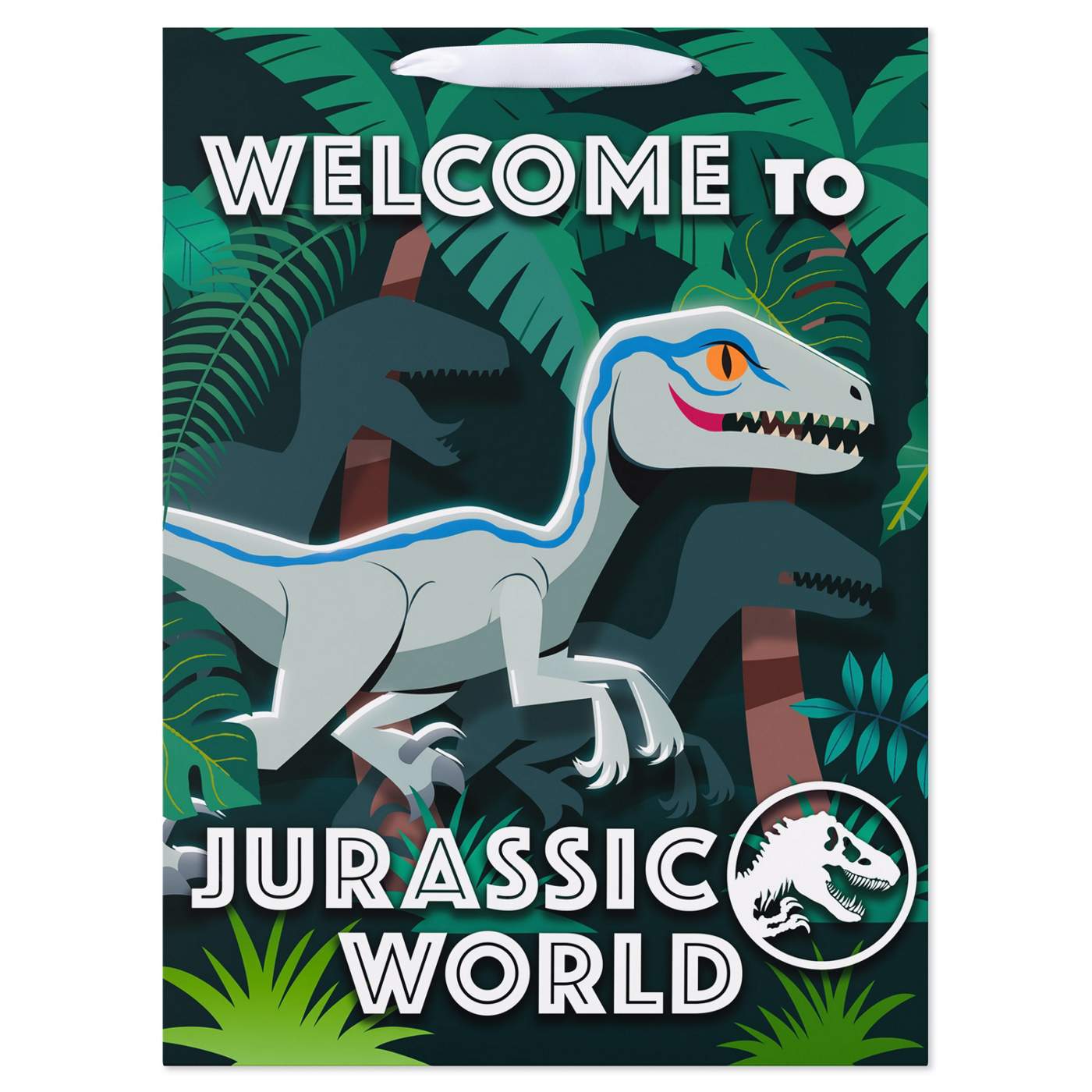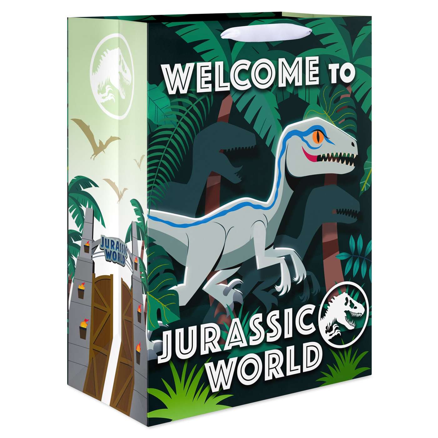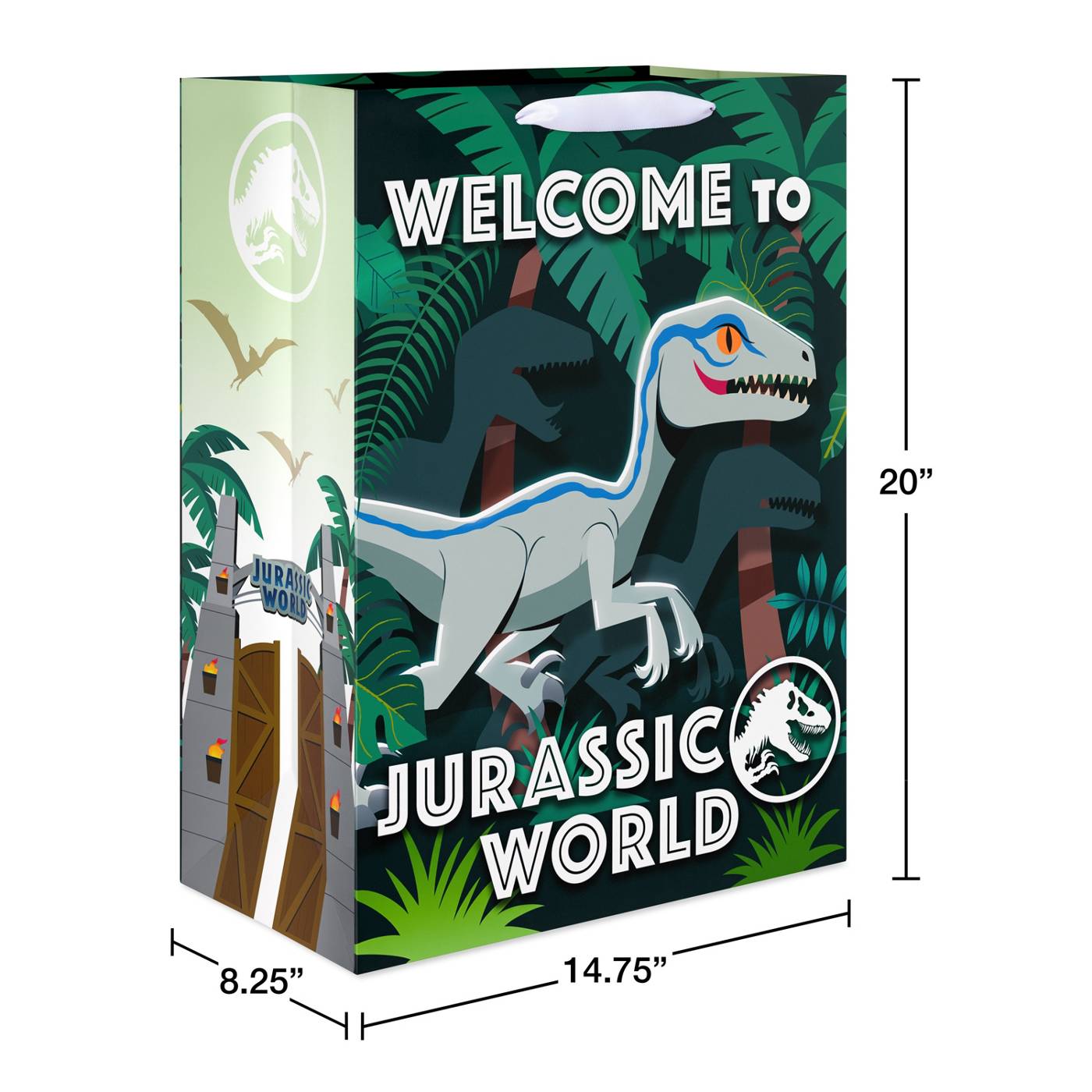 • Jurassic Park themed gift bag features vibrant, action-packed graphics from the movie including lush jungles and iconic Jurassic World gates