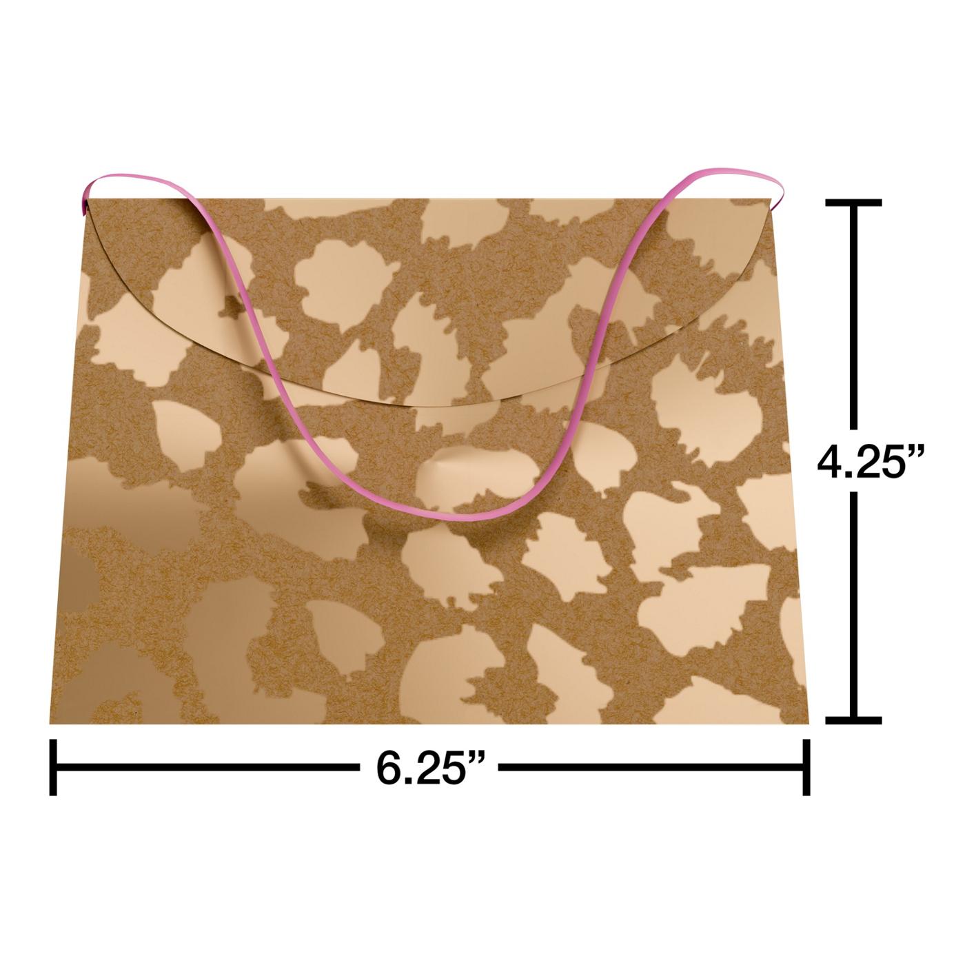 • This gift card holder shaped as a purse features elegant gold leopard print pattern with a sleek pink ribbon closure.