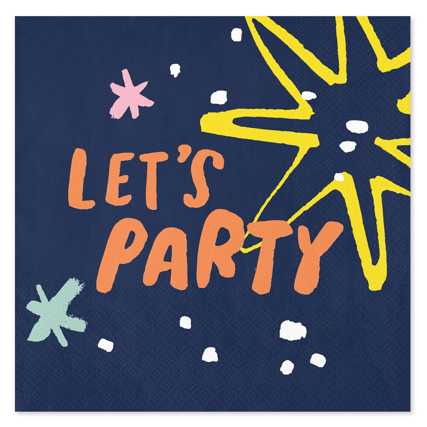 • Lunch napkins are 2-ply and feature 'Let's Party' with colorful lines around it
