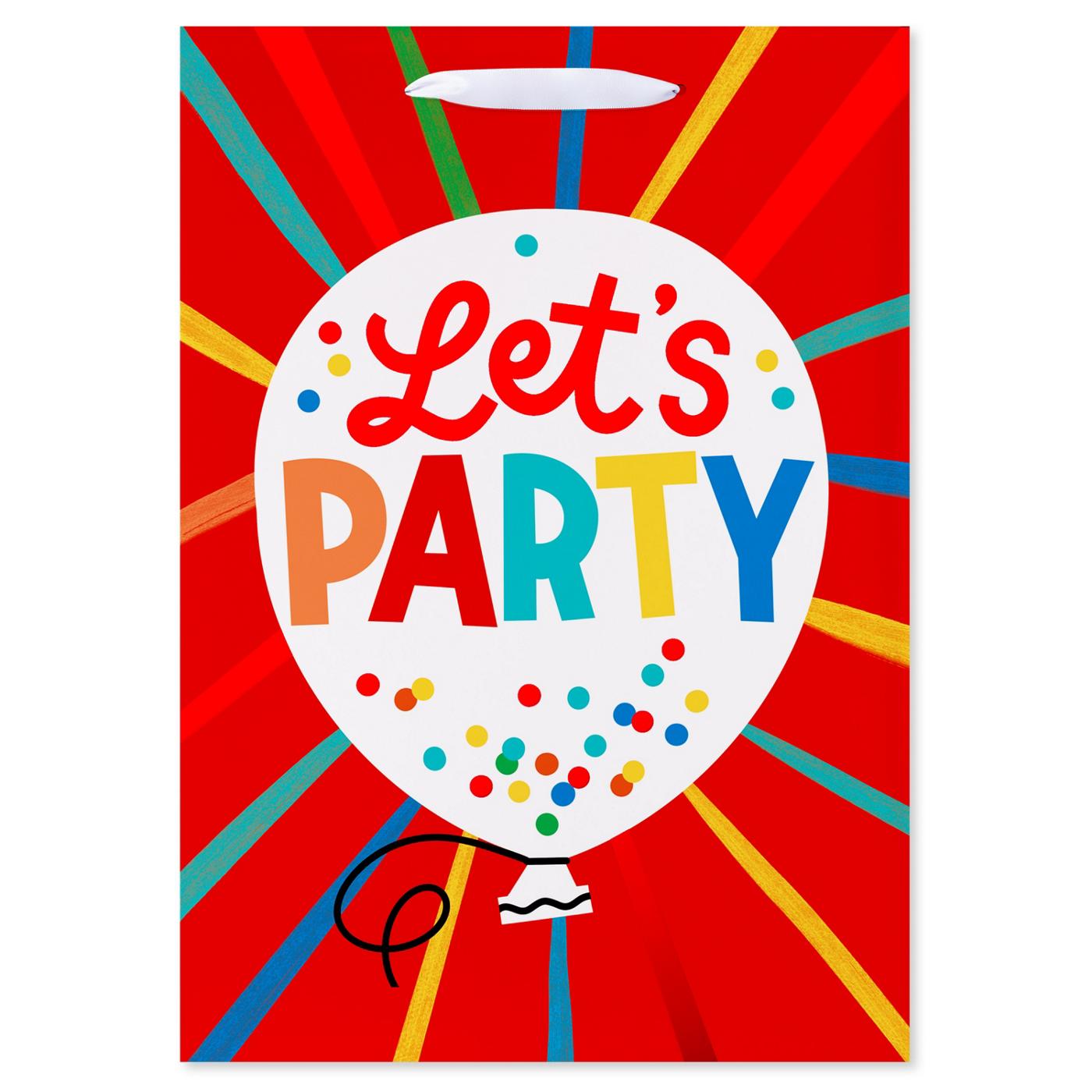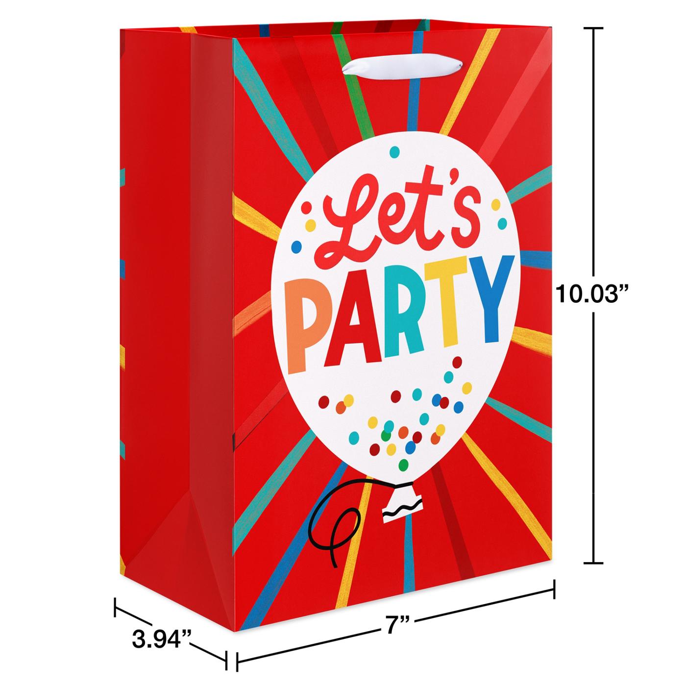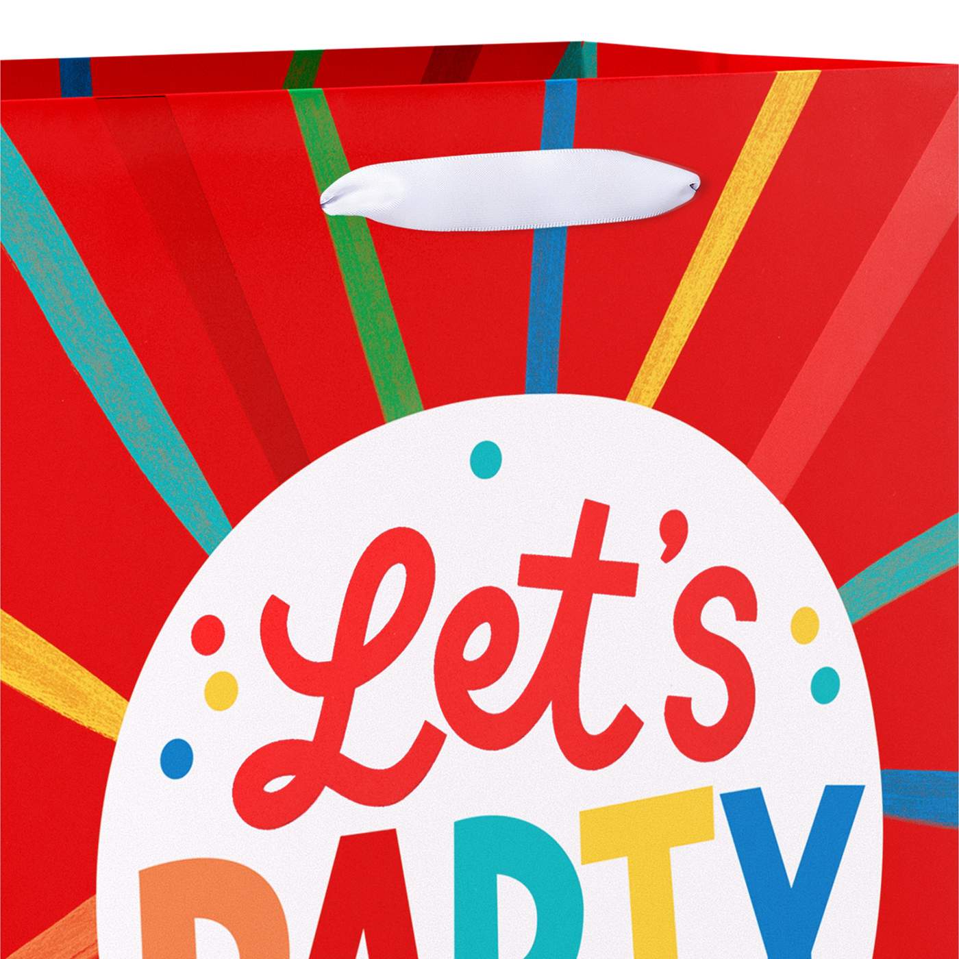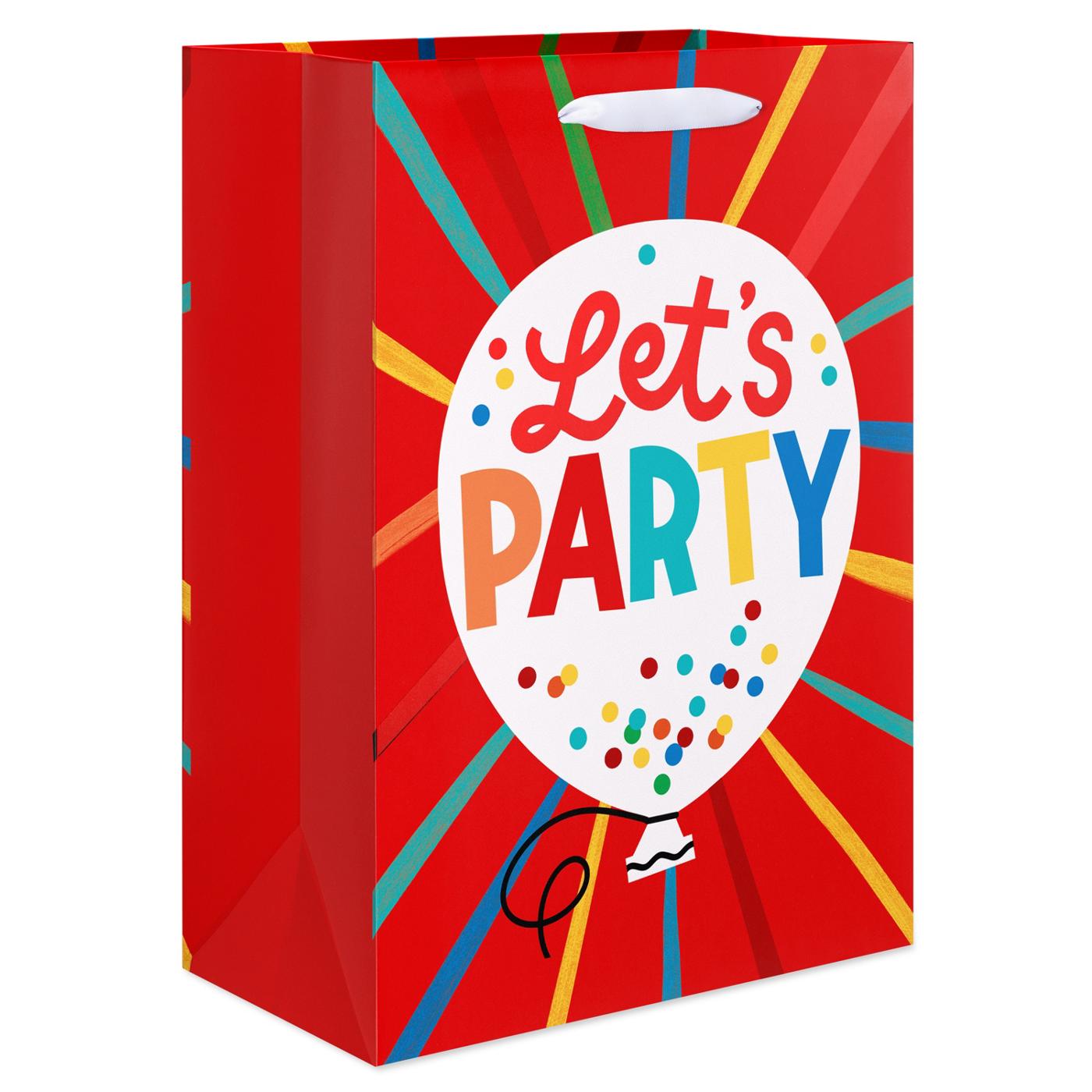 • This birthday gift bag features a vibrant 'Let's Party' message encircled by colorful confetti dots on a bold red background