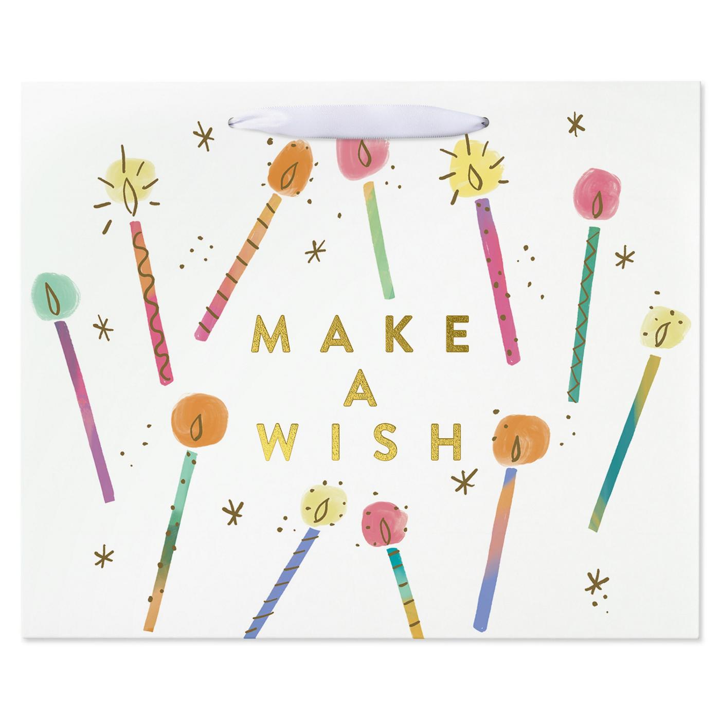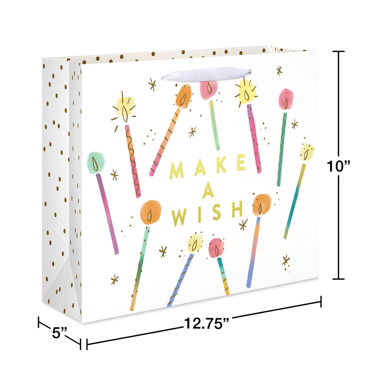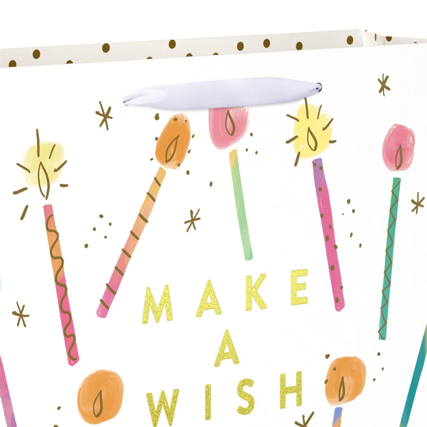 • This gift bag features vibrant and colorful birthday candles with MAKE a WISH in gold lettering on white background and white satin handle