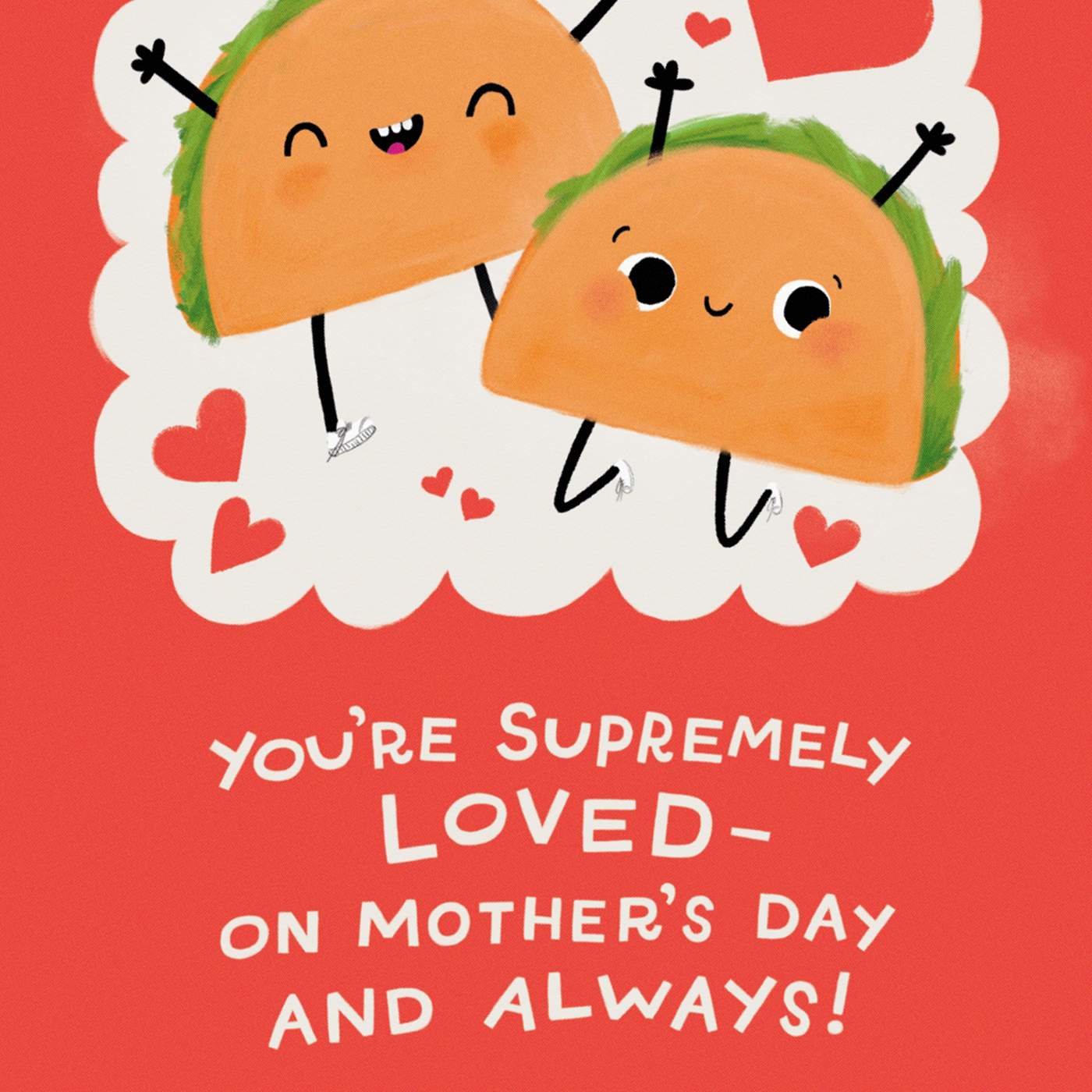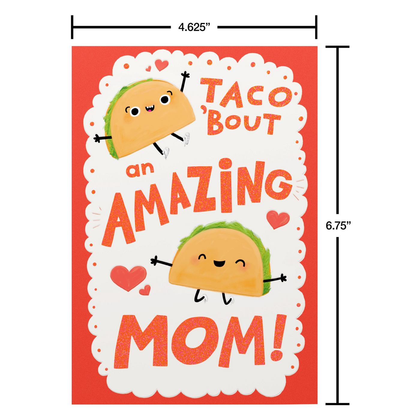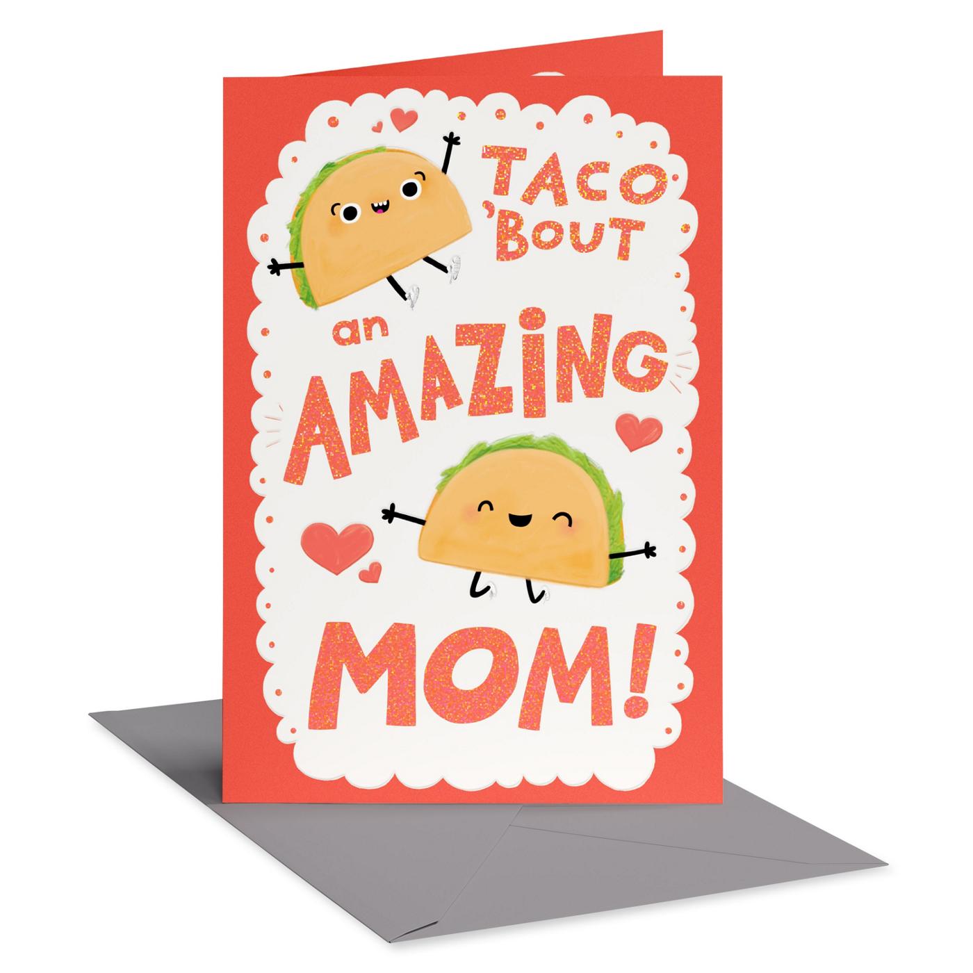 • DESIGN & FINISHINGS: Cheerful taco characters dance inside a scalloped white doily-style frame on a bright coral background, accented with hearts. Bold, oversized lettering is enhanced with shimmering foil accents and a subtle textured finish to brighten Mom's day.