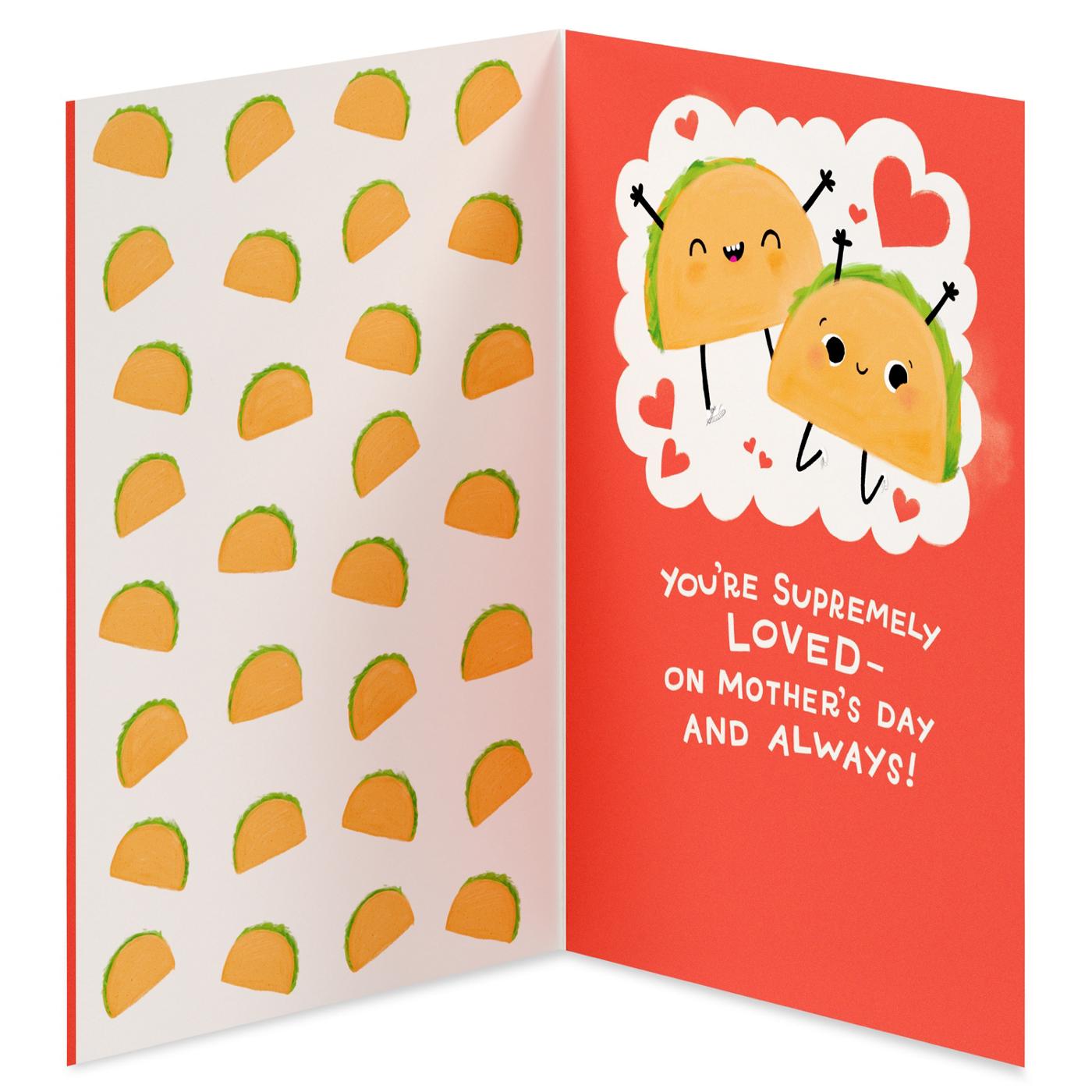 Make Mom smile this Mother’s Day with an irresistibly cute card that pairs playful art with a heartfelt message. Featuring two happy taco characters, a scalloped doily-style white frame, and bright coral accents, this card delivers a fun, food-themed twist on a classic Mother’s Day greeting. The inside message lovingly reminds her she is supremely loved on Mother’s Day and always, making it perfect for children who want to share warmth and appreciation in a lighthearted way. The design includes repeating taco motifs on the inner left panel and cheerful hearts that reinforce the joyful, affectionate tone. This card works well for a quick note from little ones, a family message from kids and partners, or as a compliment to a small gift, flowers, or homemade treats. Its bold, sparkling lettering and foil-enhanced details give the card a special, celebratory feel while remaining easy for kids to personalize with drawings or signatures. Thoughtfully sized to fit in standard displays and frames once opened, this card is ready to tuck into a gift bag or hand-deliver at brunch, school celebrations, or a family gathering. American Greetings offers exceptional greeting cards, gift wrap and celebration products so you can connect in ways that fit your personality and authentic style.
