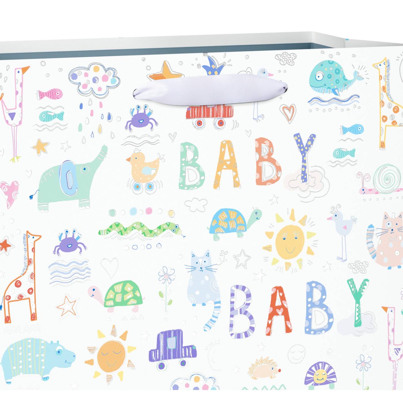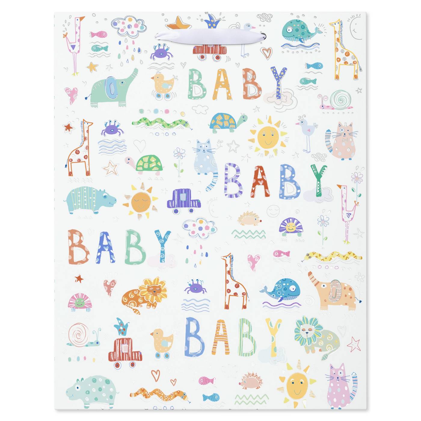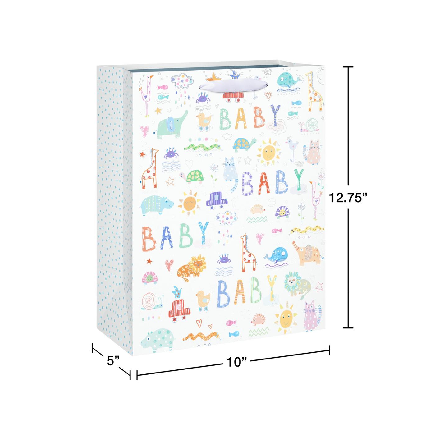 Welcome baby to the world with a gift wrapped in this cute Large Gift Bag. The fun and colorful bag features all kinds of familiar baby icons from elephants and cars to lions and ducks and so many more. The bright bag with metallic shimmer and embossing also has the word “BABY” as part of the pattern. It’s perfect for friends, family, co-workers, kids, adults, or anyone else celebrating a birthday. The bag is ideal for holding clothing, books, toys, or any hard-to-wrap gift! Complete your gift presentation with tissue paper (sold separately) for the perfect finishing touch!