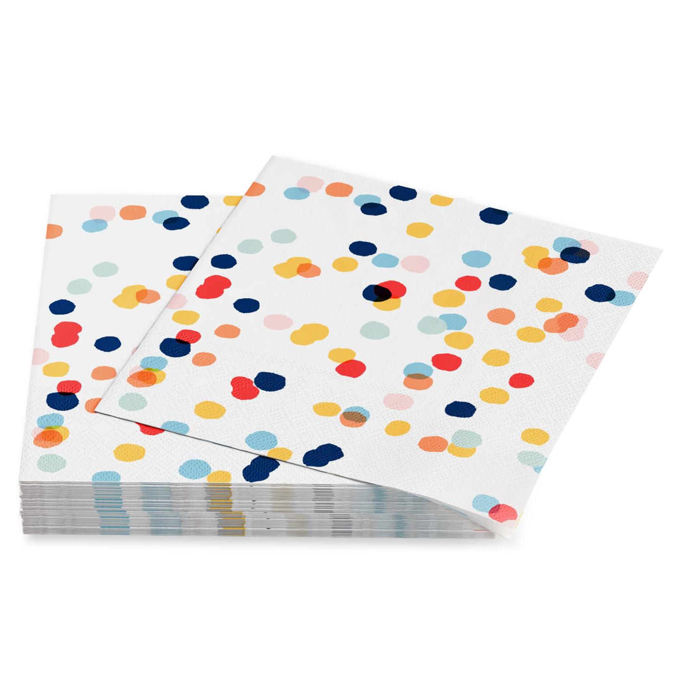 • Birthday beverage napkins are 2-ply and feature scattered colorful dots on a white background.