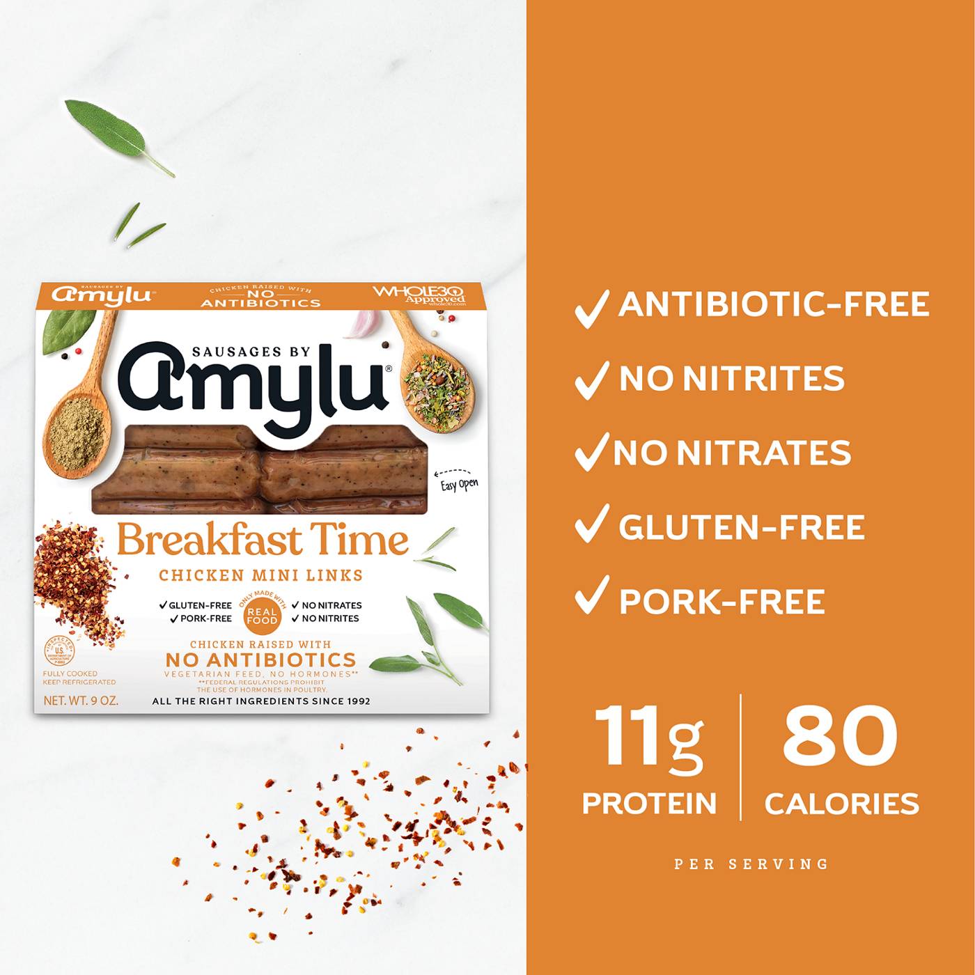 Start your mornings off right with Amylu Foods Breakfast Time Chicken Mini Links. Made with antibiotic-free chicken, these premium breakfast sausages are crafted with simple, clean and high-quality ingredients, are gluten-free, dairy-free, pork-free, contain no fillers or preservatives, and are a great way to start your mornings. These mini links are a fresh new take on the traditional breakfast sausage, bringing authentic culinary taste and depths of flavor to your kitchen. Each serving packs 11g of protein and 80 calories, making it a perfect choice for skillets, breakfast burritos, omelets, or even served alone. Whole 30 approved and fully-cooked, these breakfast sausages allow you to prepare high-quality and nutritious breakfasts quickly – combining premium ingredients and gourmet flavors with unmatched convenience. Whether you’re eating clean or just want a satisfying meal or snack, these breakfast sausages bring full flavor with wholesome ingredients you can trust and feel good about feeding the entire family.