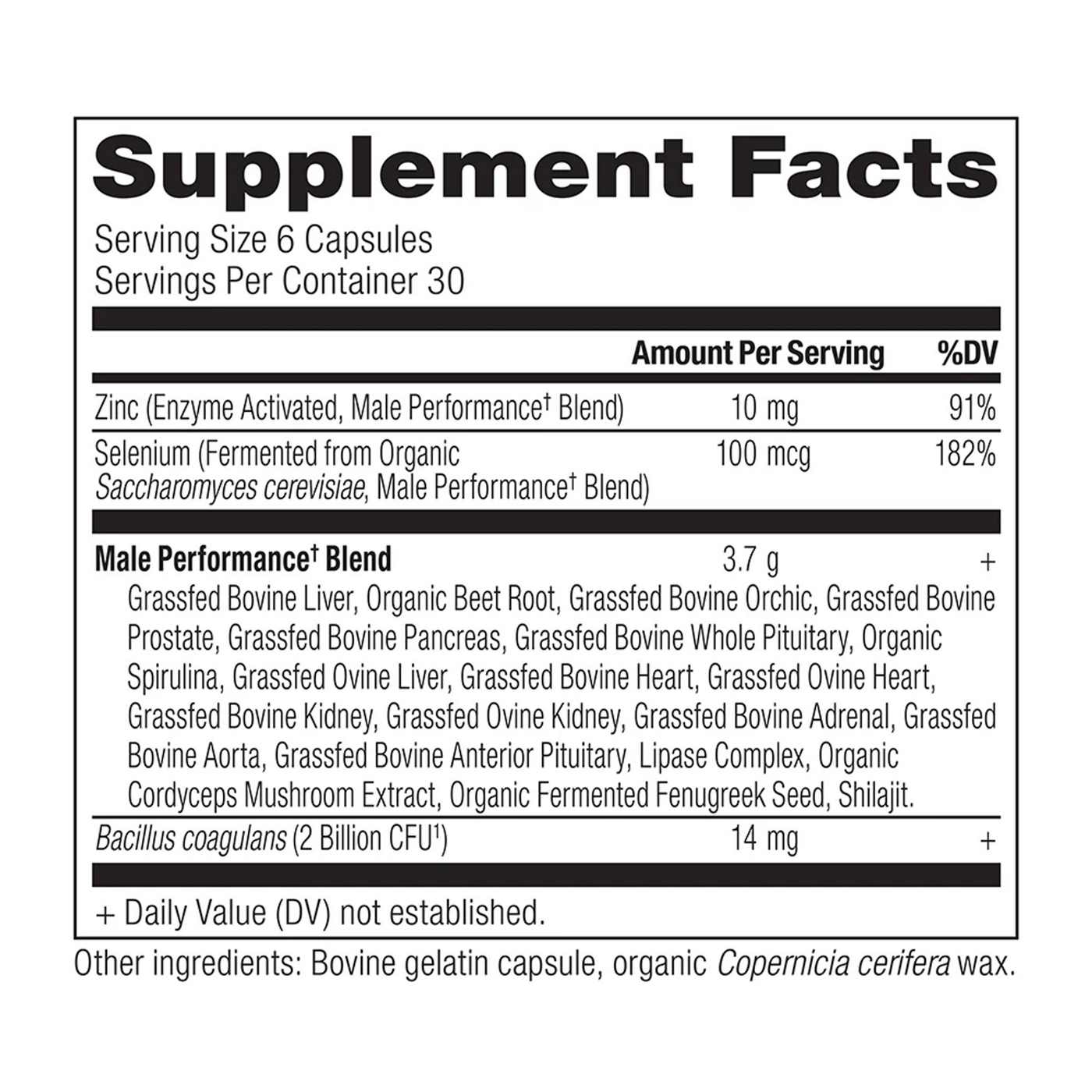 Zinc (Enzyme Activated, Male Performance† Blend), Selenium (Fermented from Organic Saccharomyces cerevisiae, Male Performance† Blend). Male Performance† Blend: Grassfed Bovine Liver, Organic Beet Root, Grassfed Bovine Orchic, Grassted Bovine Prostate, Grassfed Bovine Pancreas, Grassted Bovine Whole Pituitary, Organic Spirulina, Grassfed Ovine Liver, Grassfed Bovine Heart, Grassfed Ovine Heart, Grassted Bovine Kidney, Grassfed Ovine Kidney, Grassted Bovine Adrenal, Grassted Bovine Aorta, Grassed Bovine Anterior Pituitary, Organic Cordyceps Mushroom Extract, Organic Fermented Fenugreek Seed, Lipase, Shilajit. Bacillus coagulans (2 Billion CFU). Other ingredients: Bovine gelatin capsule, organic Copernicia cerifera wax.Allergens and safety warnings