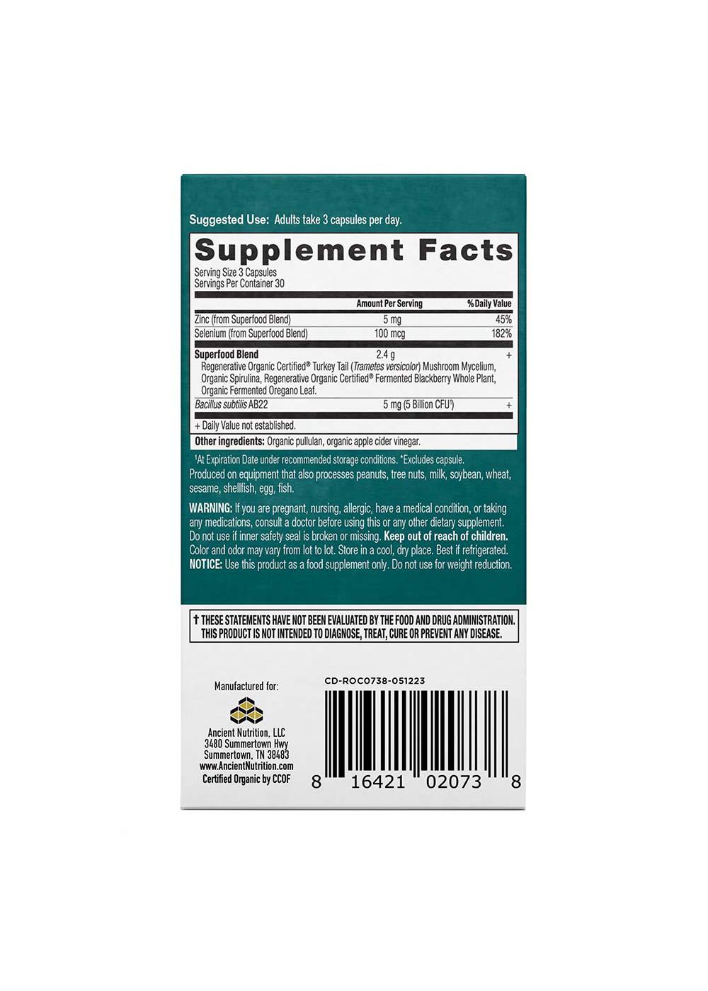 Zinc (from Superfood Blend), Selenium (from Superfood Blend), Superfood Blend Regenerative Organic Certified Turkey Tail (Trametes versicolor) Mushroom Mycelium, Organic Spirulina, Regenerative Organic Certified Fermented Blackberry Whole Plant, Regenerative Organic Certified Fermented Oregano Leaf. Bacillus subtilis AB22. Other Ingredients: Organic pullulan, organic apple cider vinegar.Allergens and safety warnings