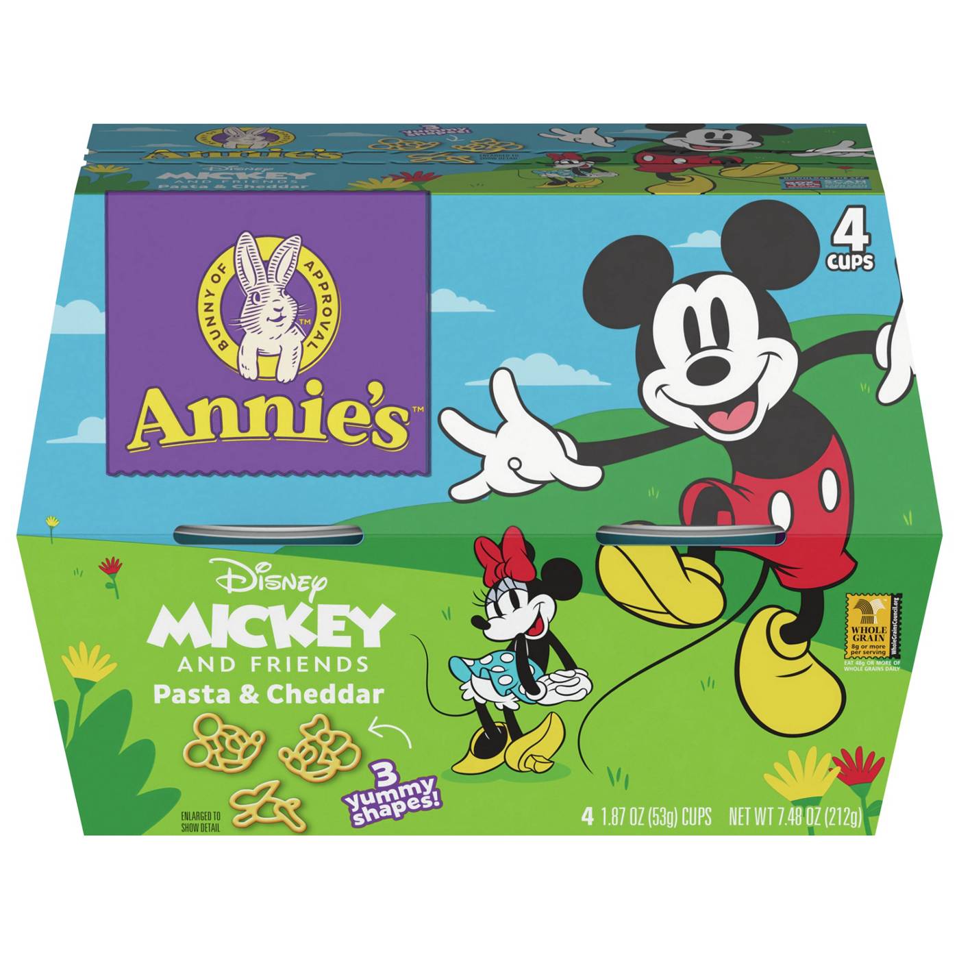 Kids will come hopping for Annie's Disney Mickey and Friends Mac and Cheese cups. Each microwavable cup comes with yummy pasta in three fun shapes: Disney's Mickey Mouse and Minnie Mouse, and an adorable bunny. Whip up a serving of cheesy, delicious goodness made with organic pasta and real cheddar cheese. Busy bunnies will love the quick and easy preparation of Annie's mac and cheese cups. Simply remove lid and cheese packet, add cold water and stir, microwave on high for about 2:30 minutes, add in the cheese, cool, and enjoy. Annie's makes products in over 20 family-friendly categories, from fruit flavored snacks and cereal to mac and cheese. For busy bunnies and families on the go, we help make life a little easier and more delicious by spreading goodness through tasty foods and kindness to the planet.DISNEY MAC AND CHEESE: Yummy Mickey Mouse pasta and cheese in convenient, microwavable cups; Pasta in three fun shapes - Disney's Mickey Mouse and Minnie Mouse, and an adorable bunnyMADE WITH ORGANIC PASTA: We craft this delicious mac and cheese with goodness in mindQUICK AND EASY: Follow the simple steps on the package to have microwavable mac and cheese ready in about 2:30 minutesTASTY VERSATILITY: Enjoy a cup by itself as a kids snack or make it a tasty addition to a lunch or dinnerCONTAINS: One 7.48 oz pack of Annie's Disney Mickey and Friends Microwavable Macaroni and Cheese; 4 cupsBOX TOPS FOR EDUCATION PARTICIPATING PRODUCT: Give back to schools with Annie's; Download the Box Tops App to learn more & start earning cash for your school or a school in need