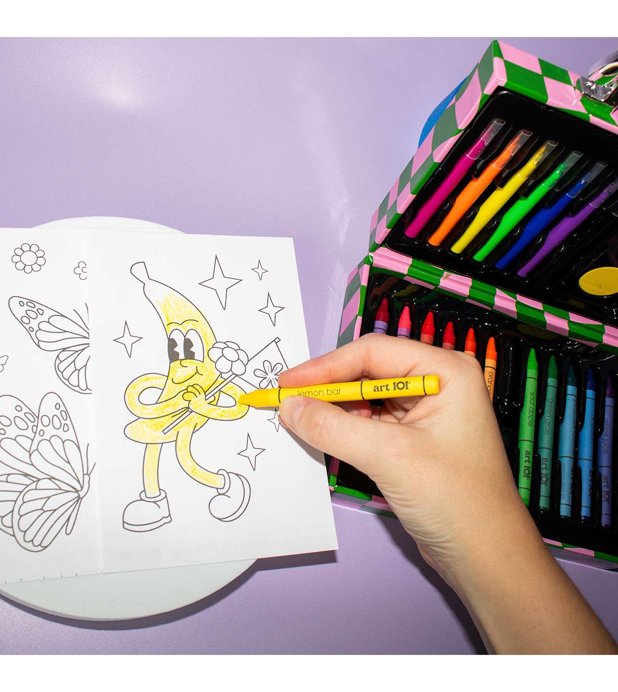 Art 101's Color and Doodle Art Set with 30 Pieces comes with everything you need to bring your creativity on the go! All in a convenient travel case with a stylish checkered design, choose from 7 markers, 12 crayons, and 3 watercolor cakes. With an included paintbrush, 3 coloring page designs, and 3 blank pages, you will never run out of creativity with this art set!