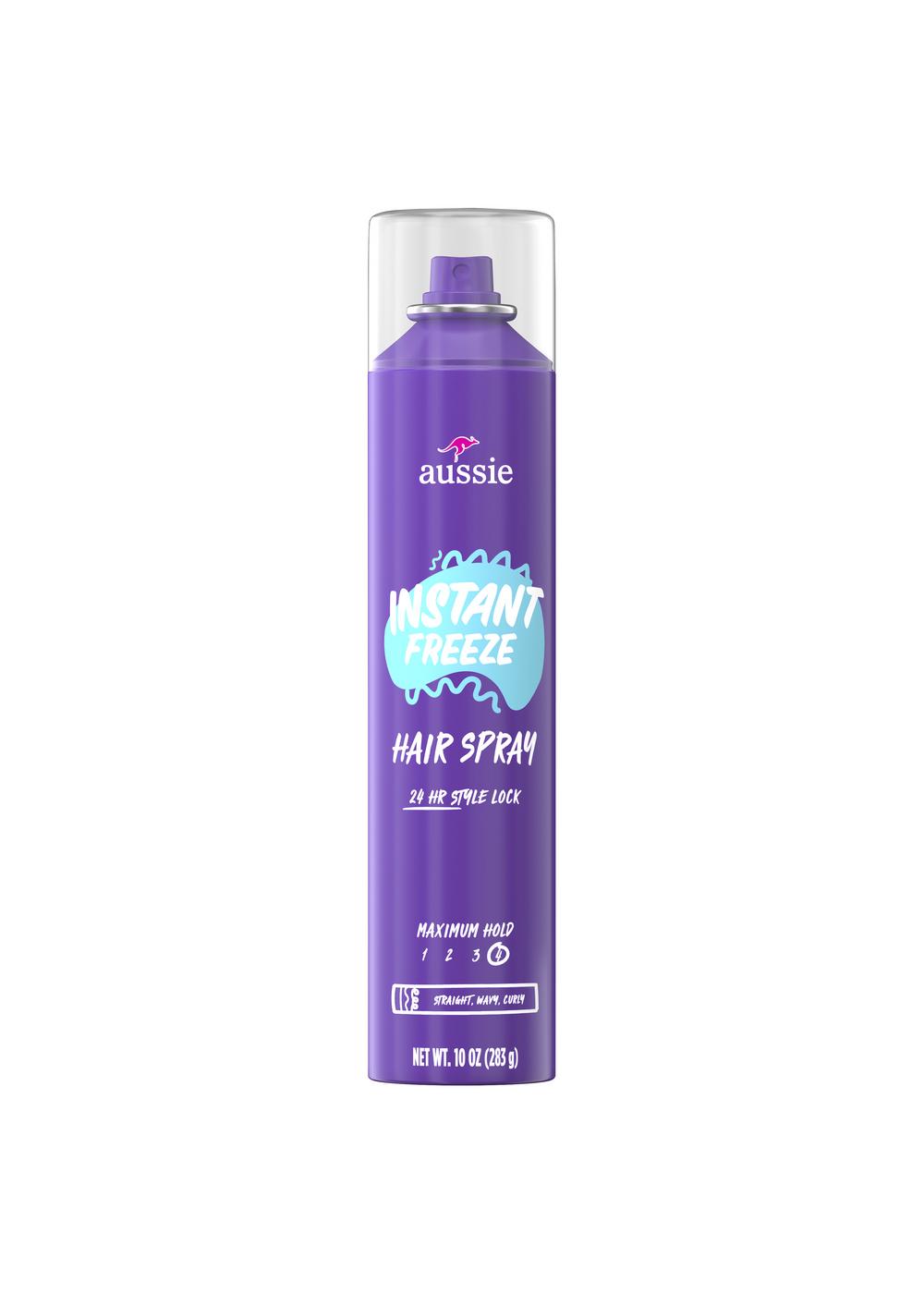 Max out your style with Aussie Instant Freeze Hair Spray. Its maximum hold keeps your style on lock for 24 hours.
