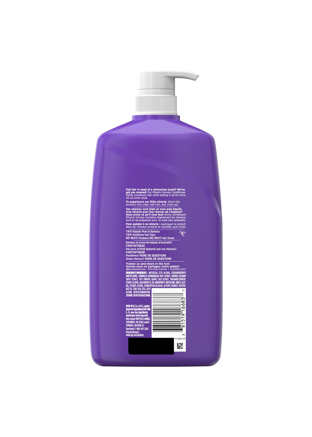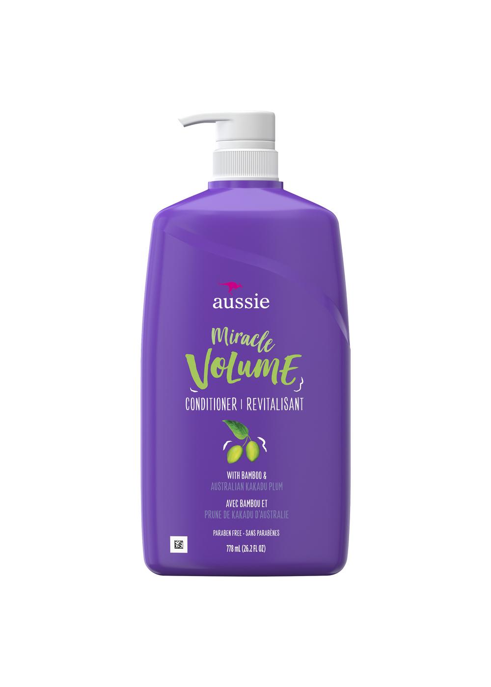 REACH FOR THE SKY. Aussie Miracle Volume Conditioner sets the volume to 10 and your look to 11. The lightweight formula is infused with Kakadu plum and bamboo and easily absorbs into strands for the right amount of softness with over-the-top body. After shampooing, smooth it on your hair, rinse and enjoy the amazing scent as you prepare your style to reach unforgettable heights.