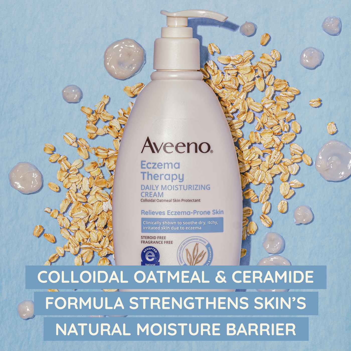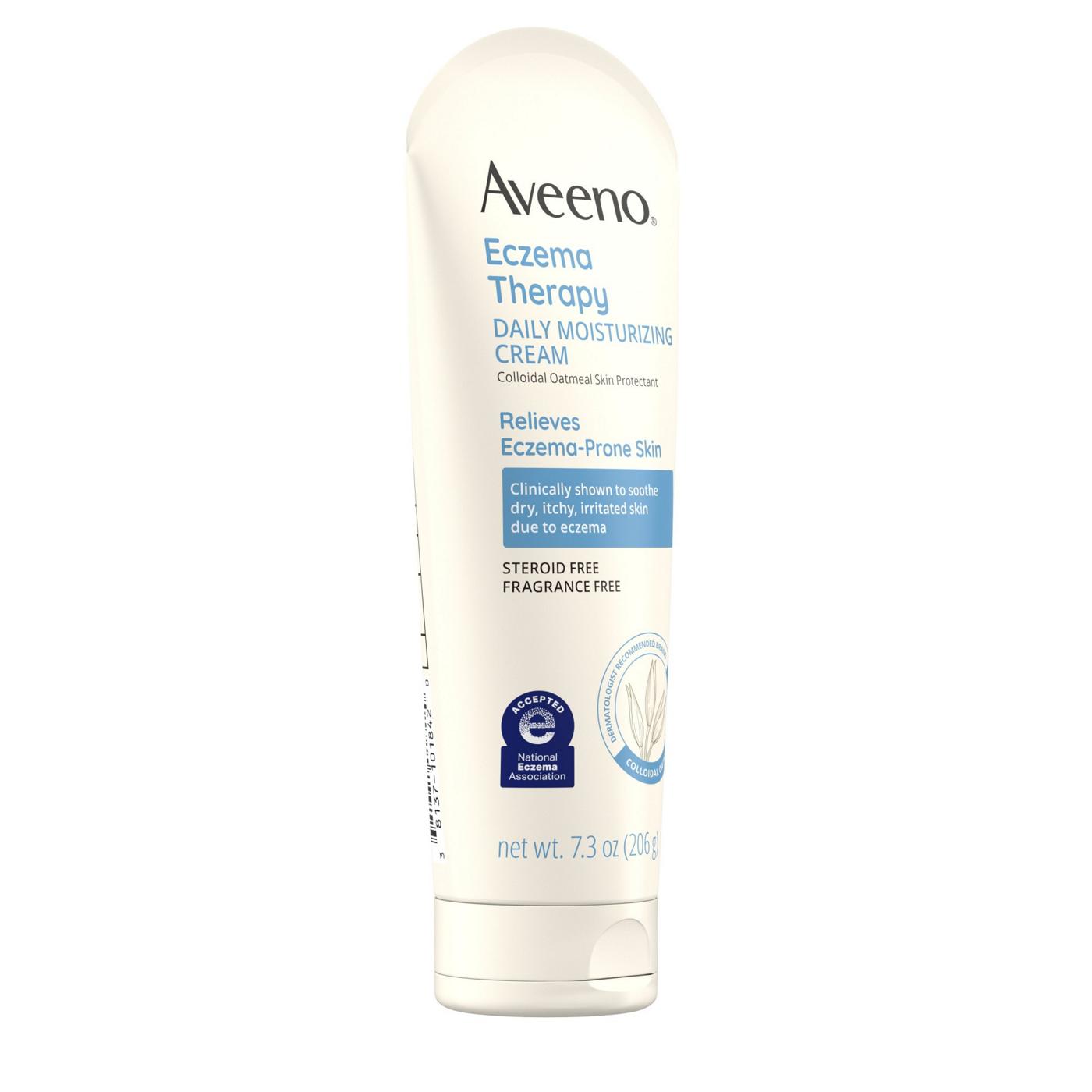 Aveeno's Eczema Therapy Daily Moisturizing Cream offers gentle yet effective care for irritated skin. Formulated with soothing colloidal oatmeal, this cream helps to relieve the key symptoms of eczema, such as dryness and itching. Its steroid-free and fragrance-free formula is designed for daily use to restore and maintain skin's moisture barrier.• Helps to relieve the key symptoms of eczema, including itching and dryness.• Formulated with colloidal oatmeal to calm and comfort dry, irritated skin.• Steroid-free and fragrance-free formula is gentle enough for daily use.• Provides long-lasting moisture to help prevent the recurrence of extra-dry skin.