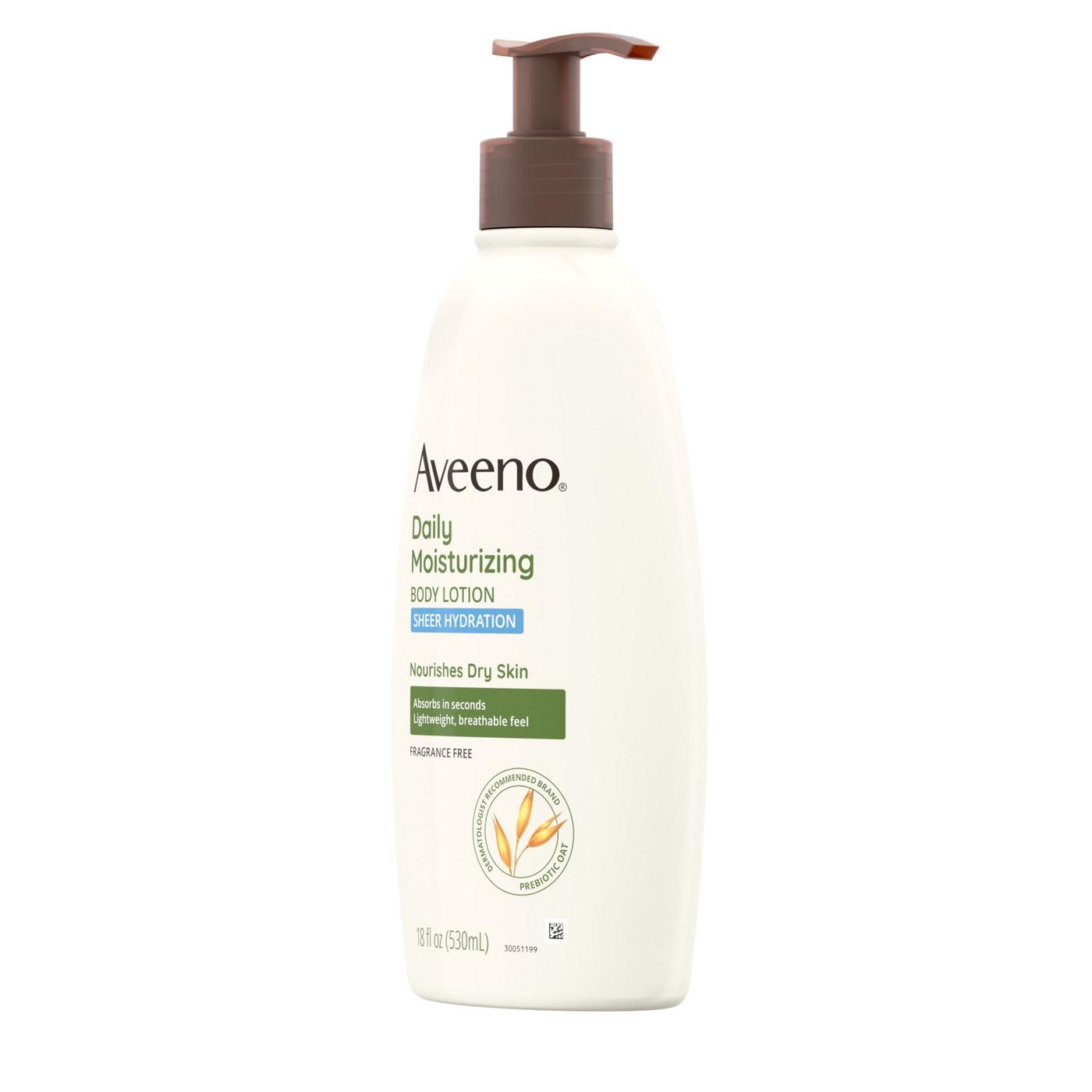 Aveeno's Sheer Hydration Daily Moisturizing Lotion offers a breathable, lightweight formula for everyday use. It absorbs in seconds, leaving skin feeling soft and hydrated without a heavy or greasy finish. This daily lotion helps nourish and replenish the skin's natural moisture.• Formulated with nourishing prebiotic oat• Provides a fresh, weightless feel• Fragrance-free for sensitive skin• Non-comedogenic formula will not clog pores