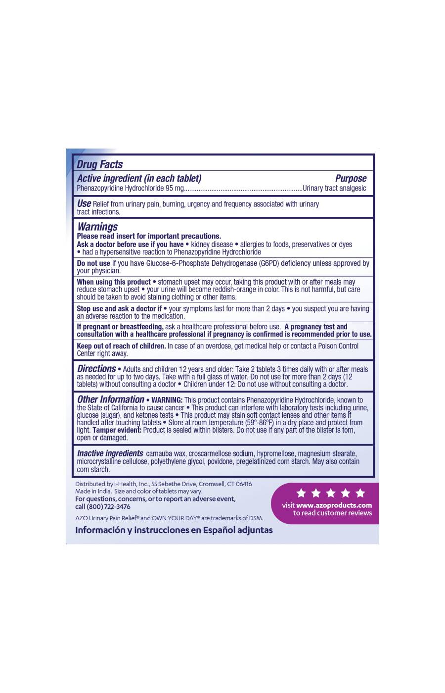 In Each Tablet Warnings: Please read insert for important precautions. Ask a doctor before use if you have: kidney disease; allergies to foods, preservatives or dyes; had a hypersensitive reaction to Phenazopyridine Hydrochloride. Do not use if you have Glucose-6-Phosphate Dehydrogenase (G6PD) deficiency unless approved by your physician. When using this product: stomach upset may occur, taking this product with or after meals may reduce stomach upset; your urine will become reddish-orange in color. This is not harmful, but care should be taken to avoid staining clothing or other items. Stop use and ask doctor if: your symptoms last for more than 2 days; you suspect you are having an adverse reaction to the medication. If pregnant or breastfeeding, ask a professional before use. A pregnancy test and consultation with a health professional if pregnancy is confirmed is recommended prior to use. Keep out of reach of children. In case of an overdose, get medical help or contact a Poison Control Center right away.
