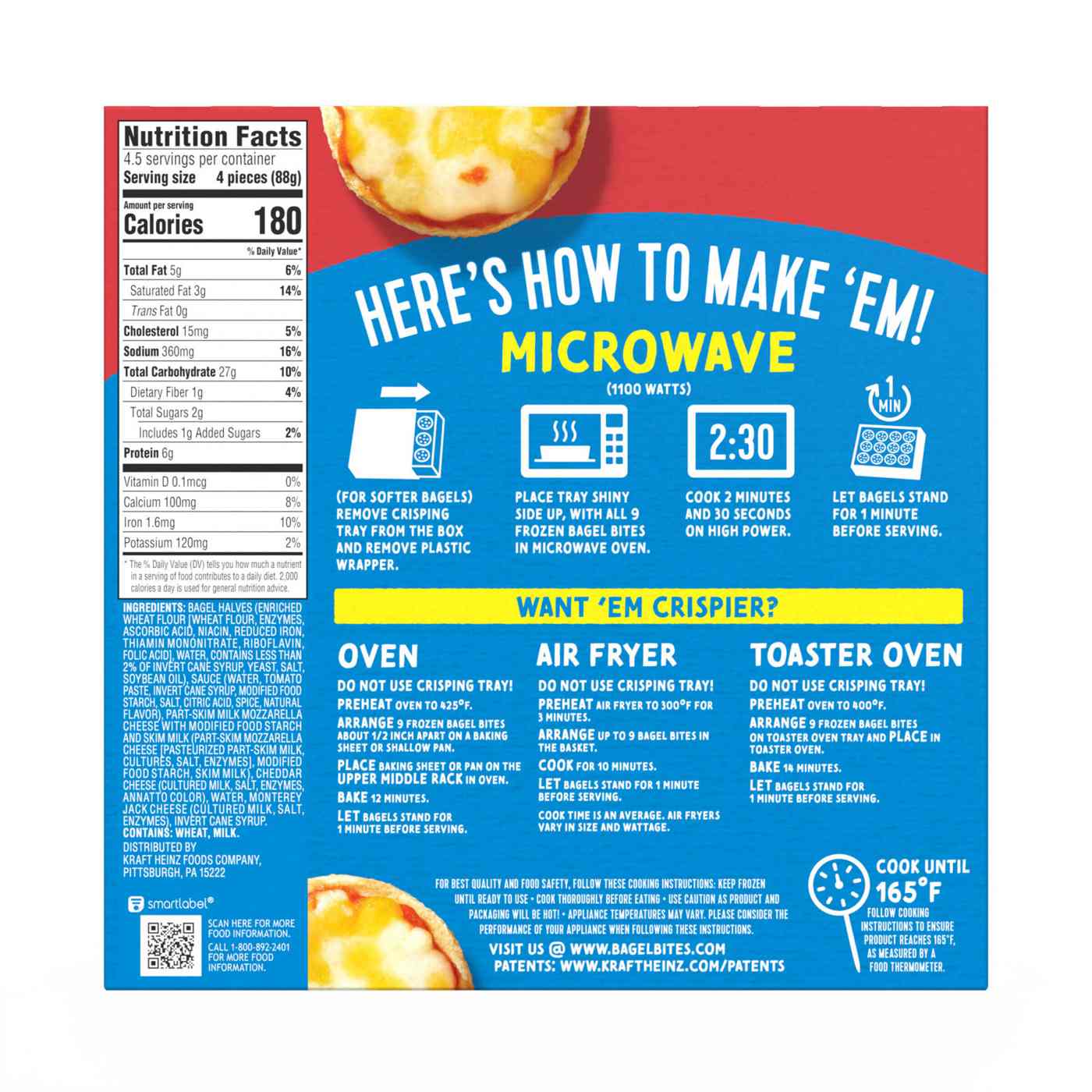 Bagel Bites Three Cheese Pizza Snacks offer a quick and easy snack that kids love and parents can easily serve. Our mini pizza bagels are topped with mozzarella cheese, cheddar cheese, Monterey Jack cheese and tomato sauce for a mouthwatering flavor that excites taste buds. Whenever you serve our mini pizza bagels, they're always a hit. Try our frozen appetizers at a party or as an after school snack. Each serving of Bagel Bites has 6 grams of protein, 0g trans fat, and no artificial flavors or high fructose corn syrup. Cook them in an air fryer, oven or toaster oven for a crispy finish, or microwave them for a quick snack. Each 18-count box of Bagel Bites Three Cheese Pizza Snacks includes a convenient microwavable crisping tray for easy prep. Keep our mini cheese pizza bagels frozen until ready to eat.• One 18 ct box of Bagel Bites Three Cheese Pizza Snacks• Bagel Bites Three Cheese Mini Bagels are an easy and fun frozen pizza snack• Each delicious frozen snack is made with tomato sauce, mozzarella, cheddar and Monterey Jack cheeses• Our pizza bagels contain no artificial flavors or high fructose corn syrup• Every serving of our frozen snacks has 6 g. of protein• Comes with convenient crisping tray for easy microwaving• Keep our mini cheese pizzas frozen until ready to eat• SNAP & EBT eligible food item
