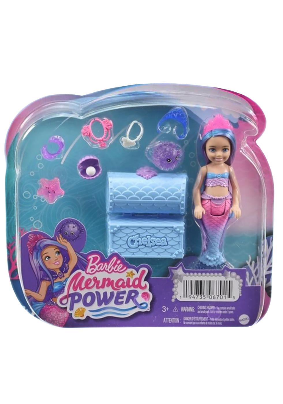 Inspired by magical adventures in Barbie Mermaid Power, Chelsea doll sparks storytelling with a magnificent mermaid look fit for undersea royalty! Chelsea doll features an ombre tail with a glittery blue fin and extra-long fantasy hair. With two sea animal friends and a chest that opens and closes, kids can play out a fantastical treasure hunt. And with so many sea-inspired accessories, they can style Chelsea doll for any adventure!