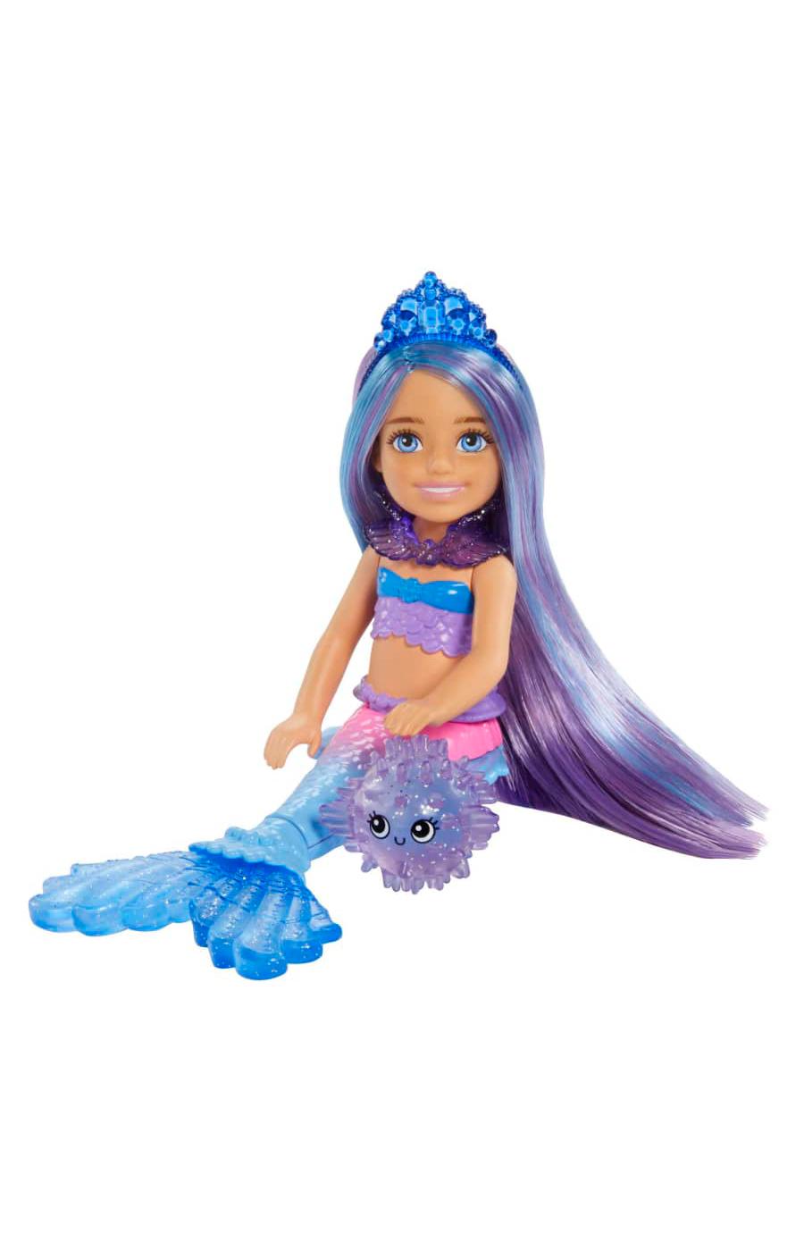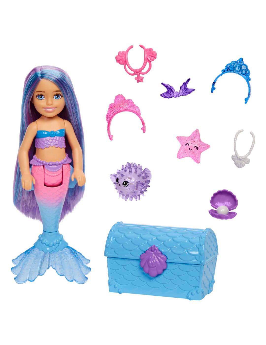 What's in the box: Includes Chelsea mermaid doll, 1 treasure chest, 1 pufferfish, 1 starfish, 1 clamshell, 3 necklaces and 2 tiaras. Colors and decorations may vary.