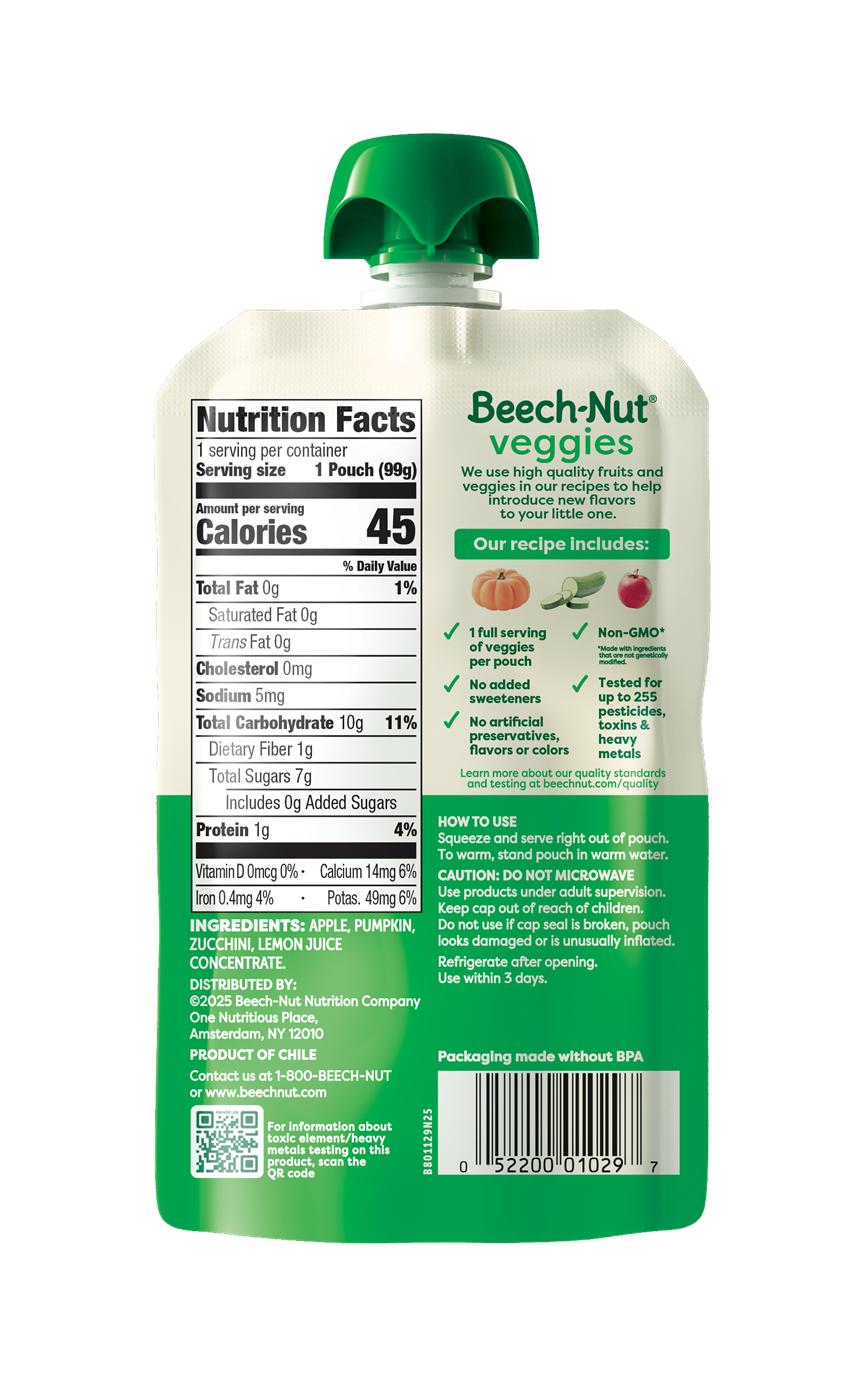 Rich pumpkin, sweet zucchini and crunchy apple with a sprinkle of real cinnamon make for a crisp, festive bounty of fall flavors inside every pouch. Stage 2 Beech-Nut Veggies pumpkin, zucchini & apple baby food pouch is made with real fruits and vegetables with nothing artificial added. This convenient pouch is great for babies starting around 6 months, and can be served to toddlers or used as a perfect lunch box snack or afterschool treat. Refrigerate after opening and serve within 3 days.