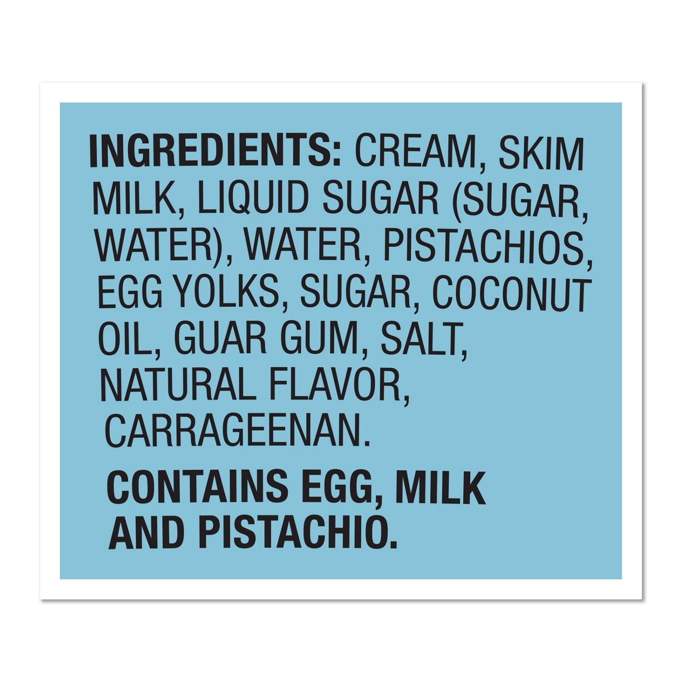 Cream, Skim Milk, Liquid Sugar (Sugar, Water), Water, Pistachios, Egg Yolks, Sugar, Coconut Oil, Guar Gum, Salt, Natural Flavors, Carrageenan.Allergens and safety warnings