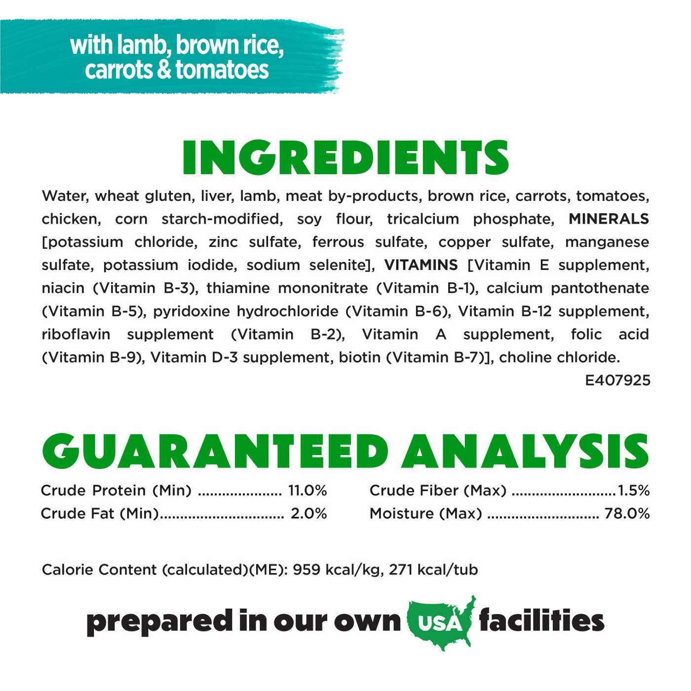 Water, Wheat Gluten, Liver, Lamb, Meat By-Products, Brown Rice, Carrots, Tomatoes, Chicken, Corn Starch-Modified, Soy Flour, Tricalcium Phosphate, MINERALS [Potassium Chloride, Zinc Sulfate, Ferrous Sulfate, Copper Sulfate, Manganese Sulfate, Potassium Iodide, Sodium Selenite], VITAMINS [Vitamin E Supplement, Niacin (Vitamin B-3), Thiamine Mononitrate (Vitamin B-1), Calcium Pantothenate (Vitamin B-5), Pyridoxine Hydrochloride (Vitamin B-6), Vitamin B-12 Supplement, Riboflavin Supplement (Vitamin B-2), Vitamin A Supplement, Folic Acid (Vitamin B-9), Vitamin D-3 Supplement, Biotin (Vitamin B-7)],Choline Chloride. E407925Allergens and safety warnings