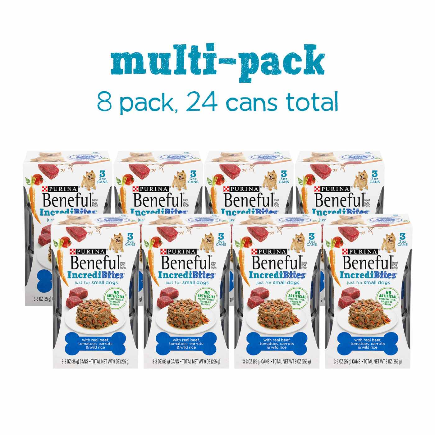 Give your little dog the taste he loves in tender, small bites perfect for his small mouth with Purina Beneful IncrediBites With Real Beef, Tomatoes, Carrots and Wild Rice adult wet dog food for small dogs. We craft this recipe using real beef and real vegetables and grains you can see to deliver a great-tasting meal made with no artificial colors, flavors or preservatives. Thoughtfully formulated for small breed dogs just like yours, this protein-rich recipe helps support strong muscles and his whole-body health. Since this recipe is 100 percent complete and balanced for adult dogs and contains 23 essential vitamins and minerals, you can feel confident that you're giving your best friend something that's good for him. With this Purina Beneful IncrediBites dog food for small dogs, he gets the delicious flavor and tender texture he craves paired with a touch of sauce for a delectable mealtime experience. Serve IncrediBites wet dog food for small breeds as a meal, or mix our recipes with his favorite dry kibble as dog food toppers for fun variety and more excitement in his bowl. We proudly produce this small dog food in Purina-owned, U.S. facilities for your assurance of high quality and safety.