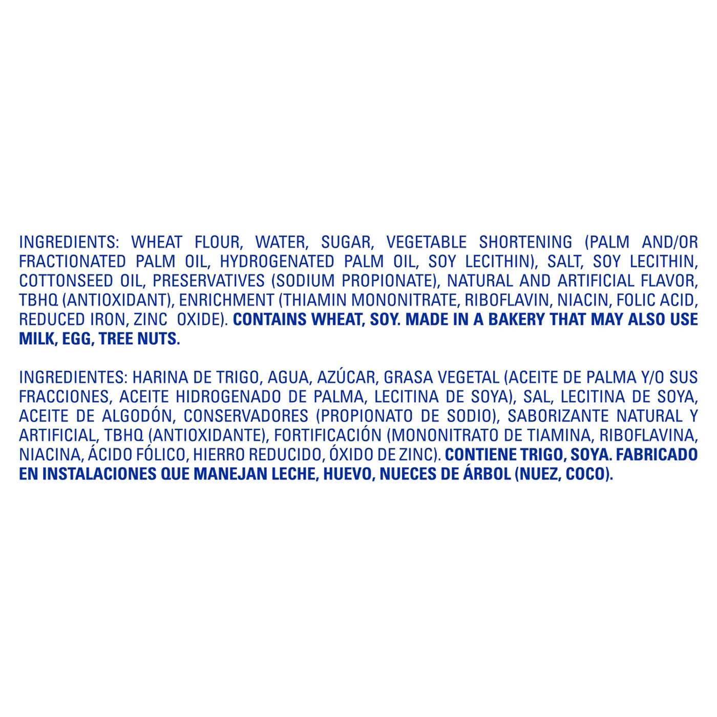 Wheat Flour, Sugar, Vegetable Shortening [Palm And/Or Fractionated Palm Oil, Hydrogenated Palm Oil, Soy Lecithin], Water, Salt, Soy Lecithin, Cottonseed Oil, Sodium Propionate (Preservative), Natural And Artificial Flavor, Sodium Metabisulfite, Tbhq (Antioxidant), Enrichment [Thiamin Mononitrate, Riboflavin, Niacin, Folic Acid, Reduced Iron, Zinc Oxide].