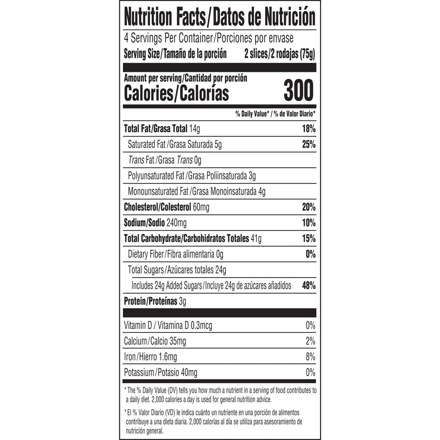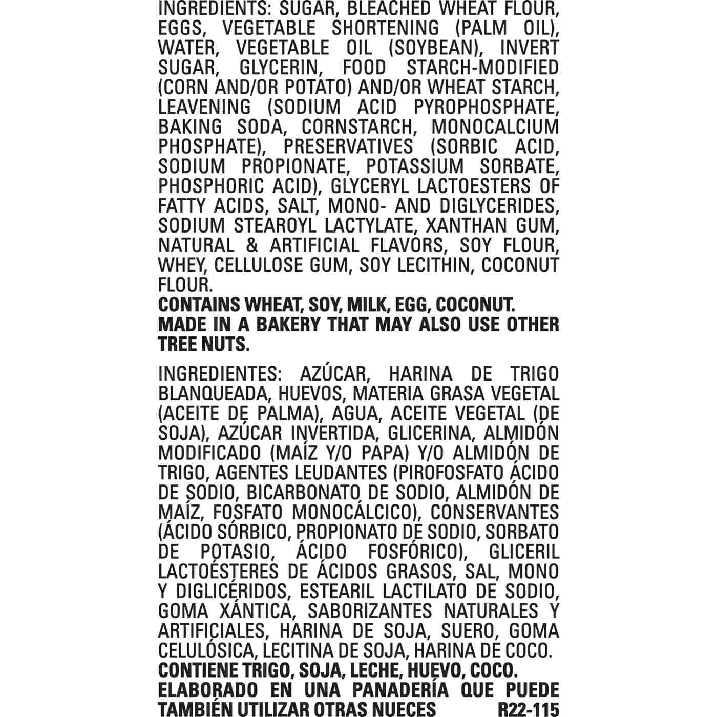 Wheat Flour, Sugar, Eggs, Vegetable Shortening [Hydrogenated Palm And Fractionated Palm Oil], Water, Corn Syrup, Cottonseed Oil, Xanthan Gum, Glycerin, Food Starch-Modified (Corn), Leavening [Baking Soda, Aluminum Sodium Sulfate, Calcium Sulfate, Monocalcium Phosphate, Sodium Carbonate], Whey Protein Concentrate (Milk), Mono & Diglycerides, Polyglycerol Esters Of Fatty Acids, Preservatives [Sorbic Acid, Sodium Propionate], Salt, Sodium Stearoyl Lactylate, Lactic Acid, Soy Lecithin, Natural & Artificial Flavor, Enrichment [Thiamin Mononitrate, Riboflavin, Niacin, Folic Acid, Reduced Iron, Zinc Oxide].Allergens and safety warnings