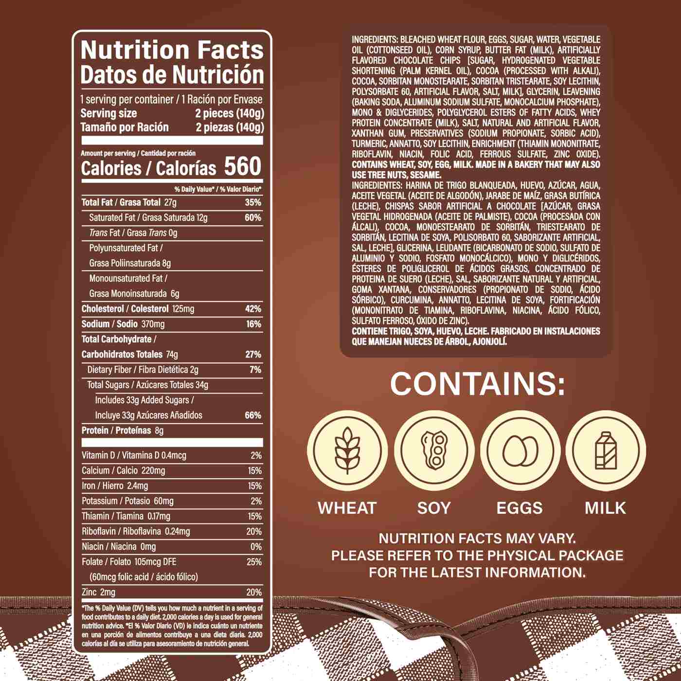 Bleached Wheat Flour, Eggs, Sugar, Water, Vegetable Oil (Cottonseed Oil), Corn Syrup, Butter Fat (Milk), Artificially Flavored Chocolate Chips [Sugar, Hydrogenated Vegetable Shortening (Palm Kernel Oil), Cocoa (Processed With Alkali), Cocoa, Sorbitan Monostearate, Sorbitan Tristearate, Soy Lecithin, Polysorbate 60, Artificial Flavor, Salt, Milk], Glycerin, Leavening [Baking Soda, Aluminum Sodium Sulfate, Monocalcium Phosphate], Mono & Diglycerides, Polyglycerol Esters Of Fatty Acids, Whey Protein Concentrate (Milk), Salt, Natural And Artificial Flavor, Xanthan Gum, Preservatives [Sodium Propionate, Sorbic Acid], Turmeric, Annatto, Soy Lecithin, Enrichment [Thiamin Mononitrate, Riboflavin, Niacin, Folic Acid, Ferrous Sulfate, Zinc Oxide].Allergens and safety warnings
