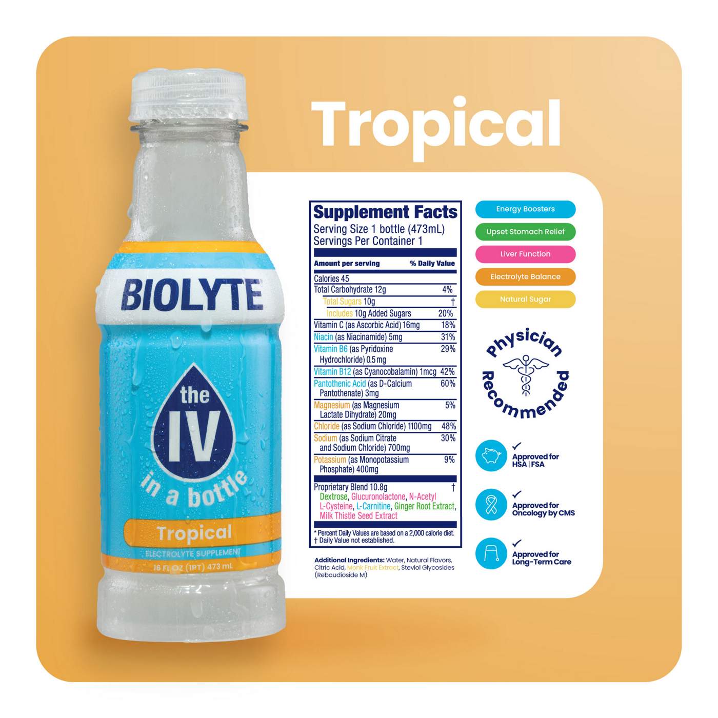 BIOLYTE is the only medical grade hydration drink to contain the same amount of electrolytes as an IV bag, plus natural ingredients that help the body get back in balance.