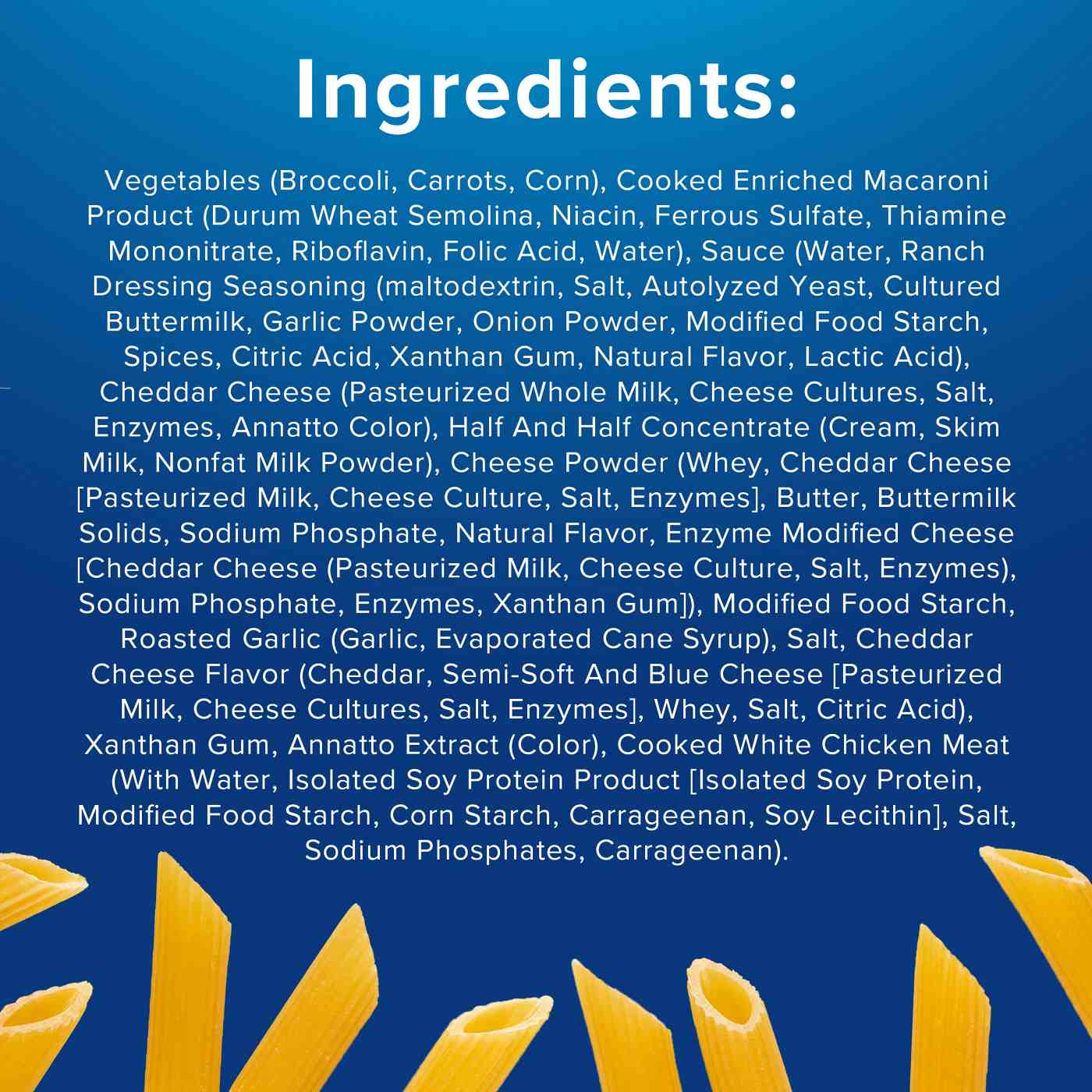 Sauce (Water, Ranch Seasoning [Maltodextrin, Salt, Autolyzed Yeast Extract, Cultured Buttermilk, Garlic Powder, Onion Powder, Modified Food Starch, Spices, Citric Acid (Flavor), Xanthan Gum, Less than 2% of: Natural Flavor, Lactic Acid], Cheddar Cheese (Pasteurized Milk, Cheese Cultures, Salt, Enzymes, Annatto (Color]], Cheese Powder [Whey, Cheddar Cheese (Pasteurized Milk, Cheese Culture, Salt, Enzymes), Butter, Buttermilk Solids, Sodium Phosphate, Natural Flavor, Enzyme Modified Cheese (Cheddar Cheese (Pasteurized Milk, Cheese Culture, Salt, Enzymes), Sodium Phosphate, Enzymes, Xanthan Gum, Cream, Nonfat Milk, Modified Corn Starch, Salt, Cheddar Cheese Flavor [Cheddar Cheese (Cultured Milk, Salt, Enzymes), Natural Flavor, Water, Whey, Blue Cheese (Cultured Milk, Salt, Enzymes, Disodium Phosphate), Disodium Phosphate, Salt], Garlic Powder, Xanthan Gum, Annatto Extract [Color]), Cooked Enriched Pasta (Water, Enriched Wheat Flour [Durum Wheat Semolina, Niacin, Ferrous Sulfate (Iron), Thiamine Mononitrate, Riboflavin, Folic Acid]), Vegetables (Broccoli, Carrots, Corn), Cooked Chicken (White Meat Chicken, Water, Olive Oil, Contains 2% or Less of Isolated Soy Protein Product Isolated Soy Protein, Modified Potato Starch, Corn Starch, Carrageenan, Soy Lecithin, Dextrose, Potassium Chloride, Salt, Sodium Phosphate, Flavoring).Allergens and safety warnings