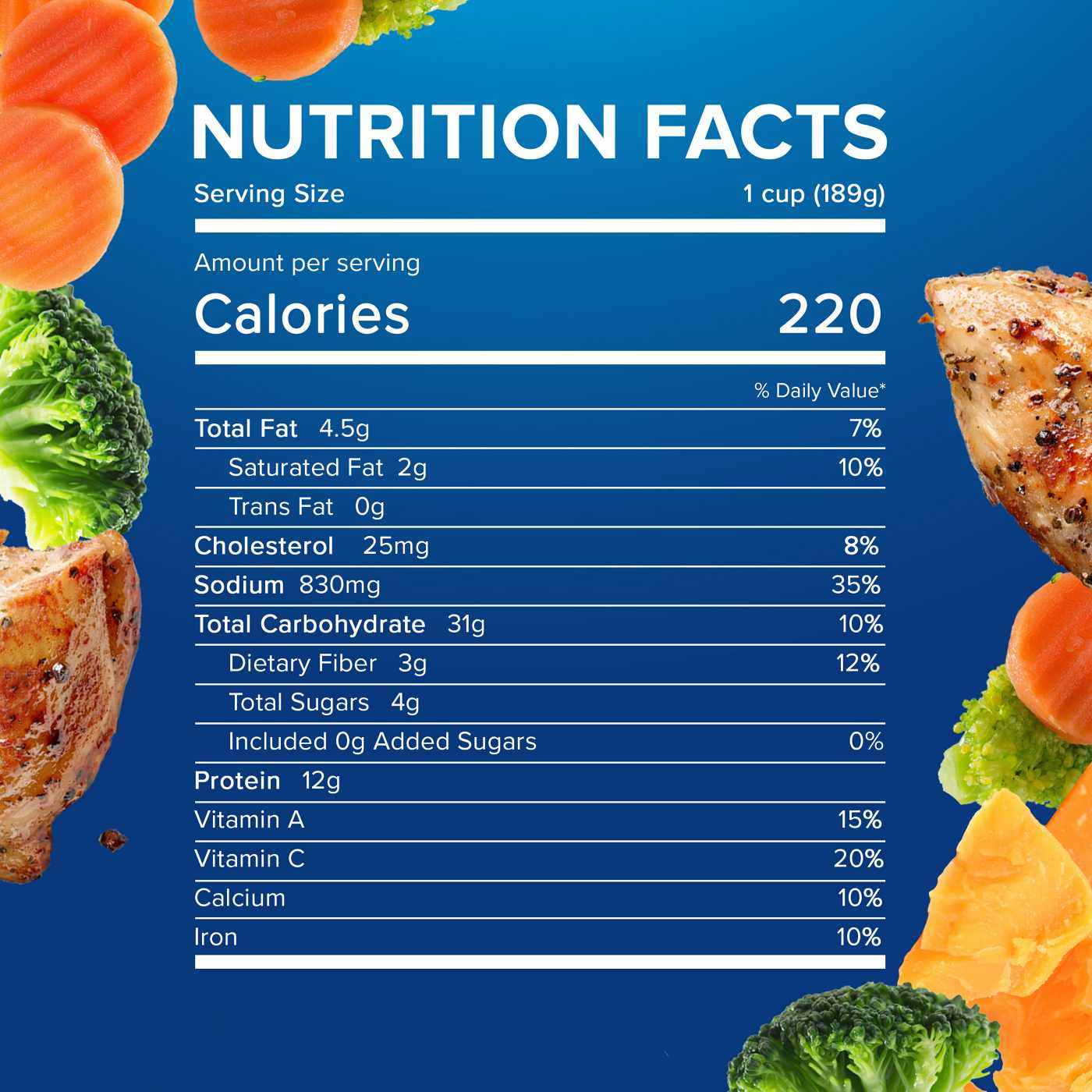 • White meat chicken, pasta and mixed vegetables are coated in a creamy ranch and cheese sauce for a hassle-free frozen family meal