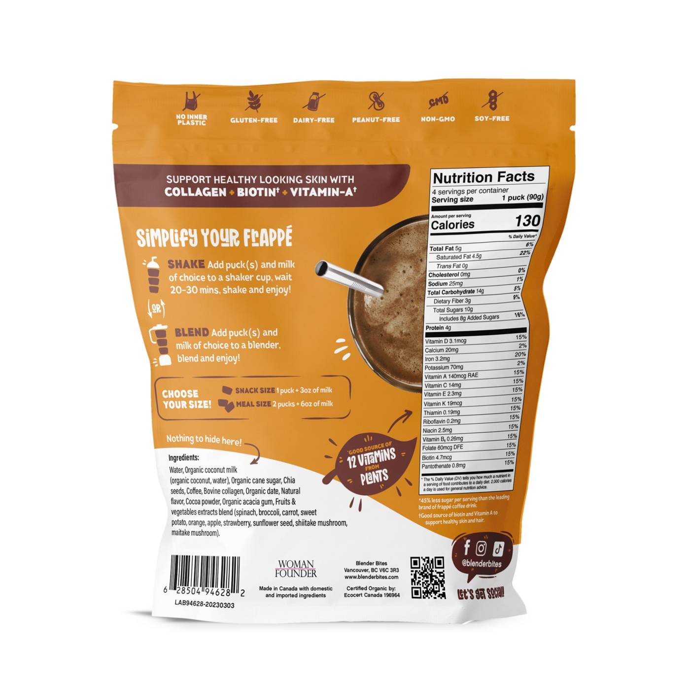 WATER, ORGANIC COCONUT MILK (ORGANIC COCONUT, WATER), ORGANIC CANE SUGAR, CHIA SEEDS, COFFEE, BOVINE COLLAGEN, ORGANIC DATE, NATURAL FLAVOR, COCOA POWDER, ORGANIC ACACIA GUM, FRUITS & VEGETABLES EXTRACTS BLEND (SPINACH, BROCCOLI, CARROT, SWEET POTATO, ORANGE, APPLE, STRAWBERRY, SUNFLOWER SEED, SHIITAKE MUSHROOM, MAITAKE MUSHROOM).